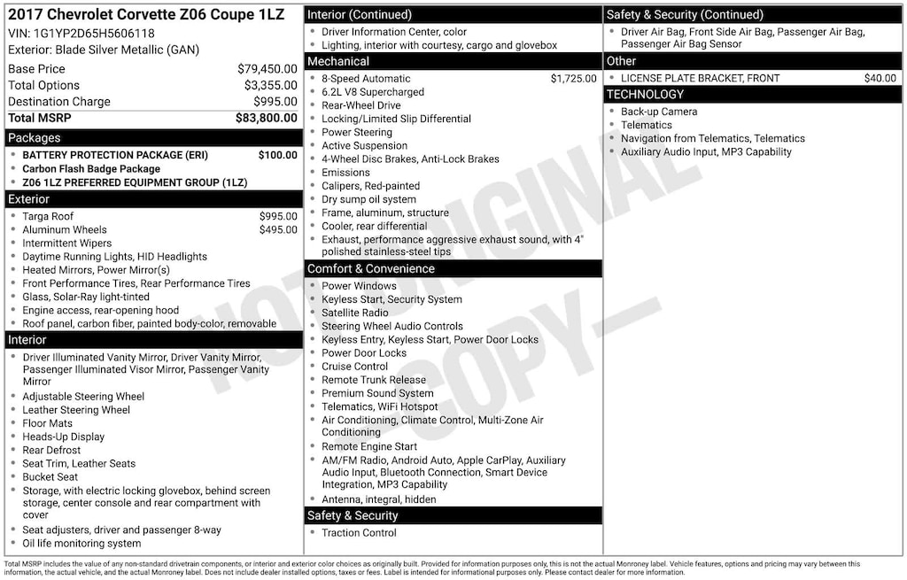 Blade Silver Metallic 2017 Chevrolet Corvette Z06 1LZ RWD 8 Speed Paddle Shift with Automatic Modes V8 Clean CarFax, 1-Piece Removable Transparent Roof Panel, 8-Way Driver & Passenger Seat Adjusters, Adaptive Suspension, AM/FM Radio: SiriusXM, Apple CarPlay/Android Auto, Automatic Temperature Control, Battery Protection Package, Bose Premium 9-Speaker Audio System Feature, Exterior Parking Camera Rear, Front Dual Zone A/C, Fully Automatic Headlights, GT Bucket Seats, Head-Up Display, Heated External Mirrors, Power Driver Seat, Power Passenger Seat, Preferred Equipment Group 1LZ, Radio: Chevrolet MyLink Audio System, Rear Window Defroster, Remote Keyless Entry, Wheels: 19 x 10 Fr & 20 x 12 Rr Z06 Black Alum.