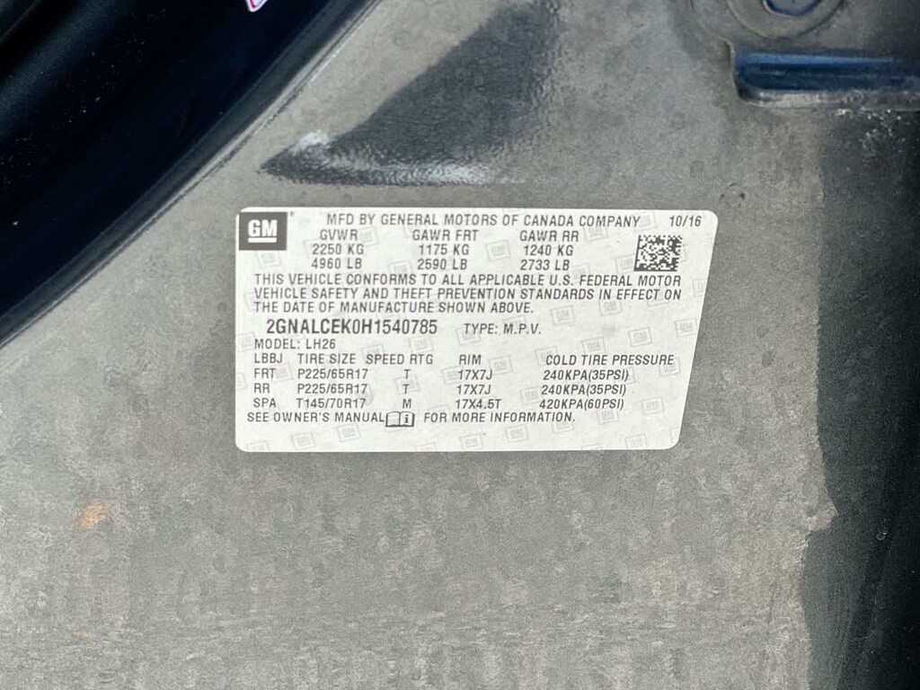 CONVENIENCE PACKAGE includes (C68) automatic climate control, (BTV) remote vehicle starter system, (NP5) leather-wrapped steering wheel with audio and cruise controls, (AE8) driver 8-way power front seat adjuster and (KA1) heated driver and passenger front seats, SEAT ADJUSTER FRONT, DRIVER 8-WAY POWER WITH POWER LUMBAR, ENGINE, 2.4L DOHC 4-CYLINDER SIDI (SPARK IGNITION DIRECT INJECTION) with VVT (Variable Valve Timing) (182 hp [135.7 kW] @ 6700 rpm, 172 lb-ft [232.2 N-m] @ 4900 rpm) (STD), TRANSMISSION, 6-SPEED AUTOMATIC WITH OVERDRIVE (STD), AUDIO SYSTEM, CHEVROLET MYLINK RADIO, 7 DIAGONAL COLOR TOUCH-SCREEN DISPLAY AM/FM/SIRIUSXM STEREO with MP3 playback capability, outside temperature indicator and Radio Data System (RDS), includes Bluetooth® streaming audio for select phones; voice-activated technology for radio and phone; Hands-Free smartphone integration with Pandora and Stitcher; Gracenote (Playlist+, Album Art) (STD).