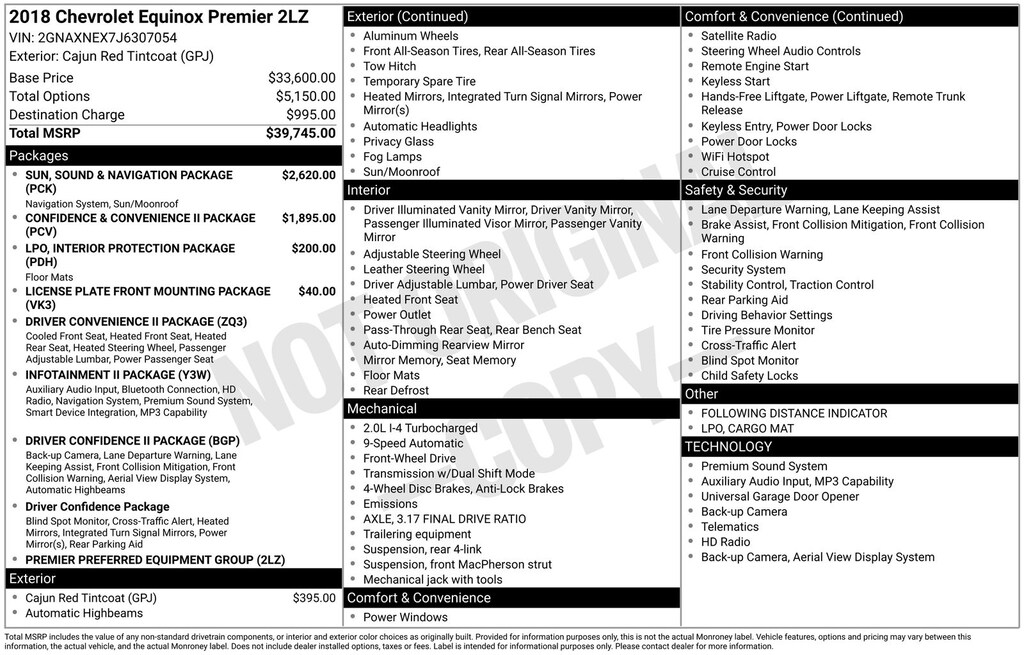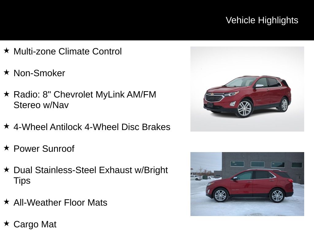 Recent Arrival! Clean CARFAX. 2018 Chevrolet Equinox Premier Is nicely equipped with Confidence & Convenience II Package, Driver Confidence II Package (Bird's Eye View Surround Vision, Following Distance Indicator, Forward Collision Alert, IntelliBeam Auto High Beam Headlamp Control, Lane Keep Assist w/Lane Departure Warning, and Low Speed Forward Automatic Braking), Driver Convenience II Package (8-Way Power Front Passenger Seat Adjuster, Heated Rear Seats, Heated Steering Wheel, Ventilated Driver Seat, and Ventilated Front Passenger Seat), Infotainment II Package (Radio: 8" Chevrolet MyLink AM/FM Stereo w/Nav, 2 Rear USB Charging-Only Ports, 2 USB Data Ports, 2 USB Ports & Auxiliary Input Jack, Bluetooth® For Phone, Bose Premium 7-Speaker Audio System Feature, HD Radio, and SiriusXM Satellite Radio), Interior Protection Package (LPO) (All-Weather Floor Mats and Cargo Mat), Preferred Equipment Group 2LZ (4-Wheel Antilock 4-Wheel Disc Brakes, Body-Color Trailer Hitch Close-Out Cover, Dual Stainless-Steel Exhaust w/Bright Tips, and Factory Installed Trailer Hitch), Sun, Sound & Navigation Package (Power Sunroof), Trailering Equipment, 3.17 Final Drive Axle Ratio, 4-Wheel Disc Brakes, 6 Speaker Audio System Feature, 6 Speakers, 8-Way Power Driver Seat Adjuster, ABS brakes, Air Conditioning, Alloy wheels, AM/FM radio: SiriusXM, Apple CarPlay/Android Auto, Auto-dimming door mirrors, Auto-dimming Rear-View mirror, Automatic temperature control, Brake assist, Bumpers: body-color, Compass, Delay-off headlights, Driver door bin, Driver vanity mirror, Dual front impact airbags, Dual front side impact airbags, Electronic Stability Control, Emergency communication system: OnStar and Chevrolet connected services capable, Exterior Parking Camera Rear, Four wheel independent suspension, Front anti-roll bar, Front Bucket Seats, Front Center Armrest, Front dual zone A/C, Front fog lights, Front Passenger 4-Way Manual Seat Adjuster, Front reading lights, Fully automatic headlights, Garage door transmitter, Heated door mirrors, Heated Driver & Front Passenger Seats, Heated front seats, Illuminated entry, Leather Shift Knob, Low tire pressure warning, Memory seat, Occupant sensing airbag, Outside temperature display, Overhead airbag, Overhead console, Panic alarm, Passenger door bin, Passenger vanity mirror, Perforated Leather-Appointed Seat Trim, Power door mirrors, Power driver seat, Power Liftgate, Power steering, Power windows, Premium audio system: Chevrolet MyLink, Radio data system, Radio: 8" Chevrolet MyLink AM/FM Stereo, Rear anti-roll bar, Rear reading lights, Rear seat center armrest, Rear window defroster, Rear window wiper, Remote keyless entry, Roof rack: rails only, Security system, Speed control, Speed-sensing steering, Split folding rear seat, Spoiler, Steering wheel mounted audio controls, Tachometer, Telescoping steering wheel, Tilt steering wheel, Traction control, Trip computer, Turn signal indicator mirrors, Variably intermittent wipers, and Wheels: 19" Ultra Bright Machined.