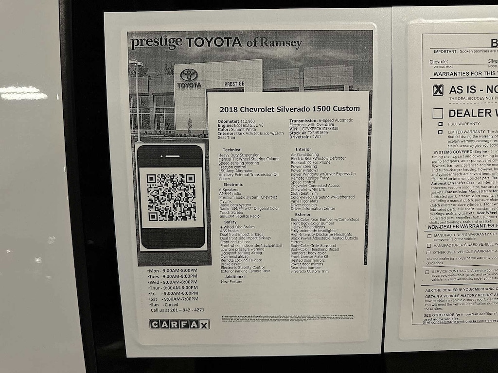 Silverado 1500 Custom, 4D Double Cab, EcoTec3 5.3L V8, 6-Speed Automatic Electronic with Overdrive, 4WD, Summit White, Dark Ash/Jet Black w/Cloth Seat Trim, 150 Amp Alternator, 3-Passenger Full-Width Folding Rear Bench Seat, Black Power Adjustable Heated Outside Mirrors, Bluetoothî For Phone, Body Color Rear Bumper w/Cornersteps, Body-Color Grille Surround, Body-Color Headlamp Bezels, Chevrolet Connected Access, Chevrolet w/4G LTE, Color-Keyed Carpeting w/Rubberized Vinyl Floor Mats, Custom Convenience Package, Custom Value Package, Deep-Tinted Glass, Driver Information Center, Electric Rear-Window Defogger, Front Body-Color Bumper, Front Frame-Mounted Black Recovery Hooks, Graphite-Colored Rubberized-Vinyl Floor Covering, Heavy-Duty Rear Locking Differential, Manual Tilt Wheel Steering Column, OnStar & Chevrolet Connected Services Capable, Power Windows w/Driver Express Up, Preferred Equipment Group 1CX, Remote Keyless Entry, Remote Locking Tailgate, Silverado Custom Trim, SiriusXM Satellite Radio, Trailering Package. Summit White 2018 Chevrolet Silverado 1500 Custom 4WD 6-Speed Automatic Electronic with Overdrive EcoTec3 5.3L V8