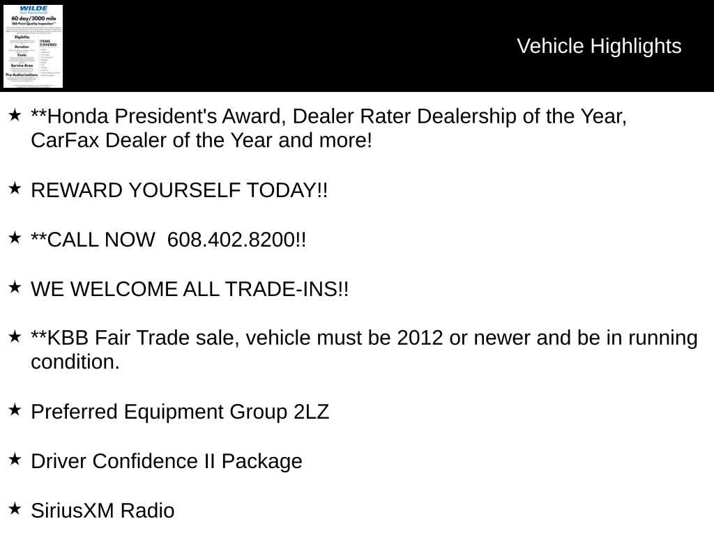 **Happy New Year!! Make your New Years Resolution to Spoil yourself with a New Car!!! To Celebrate were running $1000 over KBB Trade-in!! Stop in for your New or Used Honda, or anything in between and see why were Dealerrater Dealer of the Year! Honda Presidents Award Dealer, and Carfax Dealer of the year, come see for yourself why were rated one of Madisons Best and rated a 4.8/5 on 5000 reviews on Cars.com!!! Also Have Corporate discounts available, see a sales associate for details.