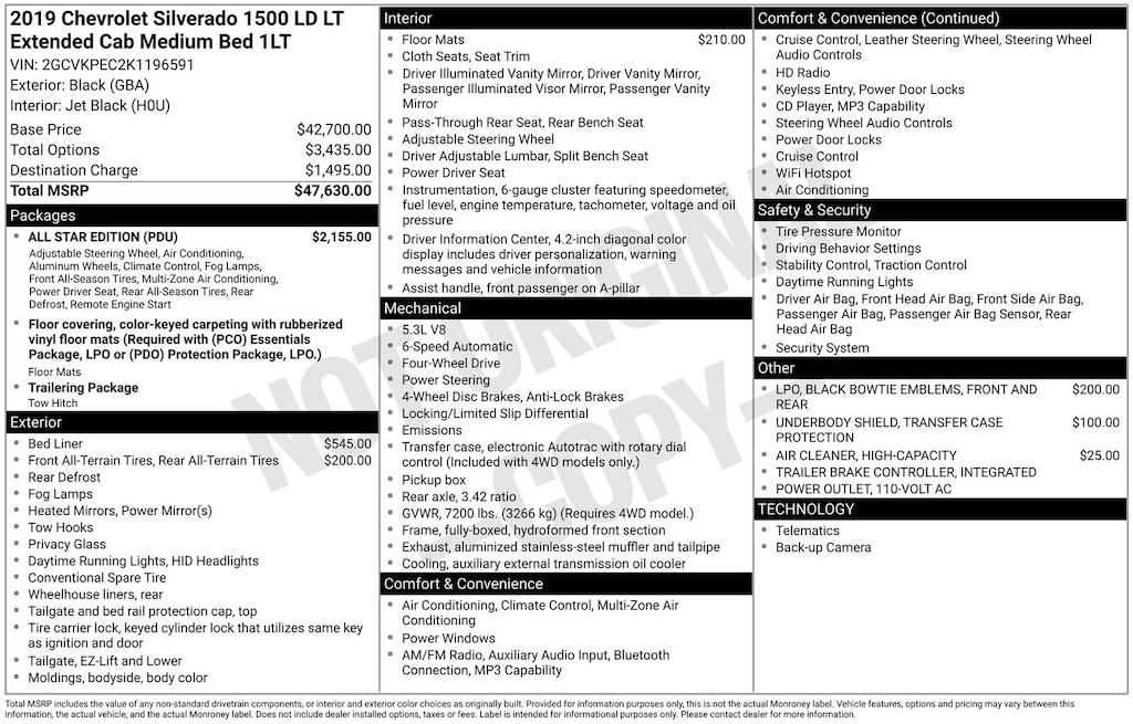 Clean CARFAX. 2019 Chevrolet Silverado 1500 LD LT Is nicely equipped with All Star Edition (10-Way Power Driver's Seat Adjuster, 110-Volt AC Power Outlet, Dual-Zone Automatic Climate Control, Integrated Trailer Brake Controller, Manual Tilt & Telescoping Steering Column, Rear-Window Electric Defogger, Remote Vehicle Starter System, and Unauthorized Entry Theft-Deterrent System), 3.42 Rear Axle Ratio, 4-Wheel Disc Brakes, 4.2" Diagonal Color Display Driver Info Center, 40/20/40 Front Split Bench Seat, 6 Speakers, ABS brakes, Air Conditioning, All-Weather Floor Liner (LPO), Alloy wheels, AM/FM radio: SiriusXM, Body Color Bodyside Moldings, Body-Color Door Handles, Body-Color Mirror Caps, Body-Color Power-Adjustable Heated Outside Mirrors, Bodyside moldings, Brake assist, CD player, Chevrolet 4G LTE, Chevrolet Connected Access, Cloth Seat Trim, Color-Keyed Carpeting Floor Covering, Compass, Deep-Tinted Glass, Delay-off headlights, Driver & Fr Passenger Illuminated Vanity Mirrors, Driver door bin, Driver vanity mirror, Dual front impact airbags, Dual front side impact airbags, Electronic AutoTrac Transfer Case, Electronic Stability Control, Emergency communication system: OnStar and Chevrolet connected services capable, Exterior Parking Camera Rear, Front & Rear Black Bowtie Emblems (LPO), Front anti-roll bar, Front Center Armrest w/Storage, Front reading lights, Front wheel independent suspension, Fully automatic headlights, HD Radio, Heated door mirrors, High-Intensity Discharge Headlights, Illuminated entry, Leather Wrapped Steering Wheel, Low tire pressure warning, Manual Tilt-Wheel Steering Column, Occupant sensing airbag, OnStar & Chevrolet Connected Services Capable, Outside temperature display, Overhead airbag, Overhead console, Panic alarm, Passenger door bin, Passenger vanity mirror, Power door mirrors, Power steering, Power windows, Premium audio system: Chevrolet MyLink, Radio data system, Radio: AM/FM 8" Diagonal Color Touch Screen, Rear 60/40 Folding Bench Seat (Folds Up), Rear reading lights, Rear step bumper, Rear Wheelhouse Liners, Remote Keyless Entry, Remote keyless entry, Remote Locking Tailgate, Single Slot CD/MP3 Player, SiriusXM Radio, Speed control, Speed-sensing steering, Split folding rear seat, Steering Wheel Audio Controls, Steering wheel mounted audio controls, Tachometer, Thin Profile LED Fog Lamps, Tilt steering wheel, Traction control, Trip computer, Variably intermittent wipers, and Voltmeter.