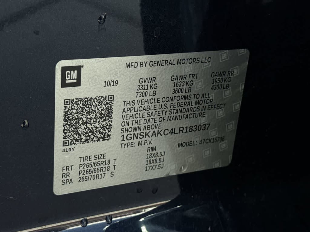 ENHANCED DRIVER ALERT PACKAGE includes (JF4) power-adjustable pedals, (UEU) Forward Collision Alert, (TQ5) IntelliBeam headlamps, (UHY) Automatic Emergency Braking, (UHX) Lane Keep Assist with Lane Departure Warning and Safety Alert Seat, AUDIO SYSTEM, 8 DIAGONAL COLOR TOUCH-SCREEN WITH CHEVROLET INFOTAINMENT AM/FM stereo with seek-and-scan and digital clock, includes Bluetooth® streaming audio for music and select phones; voice-activated technology for radio and phone; and Shop with the ability to browse, select and install apps to your vehicle. You can customize your content with audio, weather and more; featuring Apple CarPlay® and Android Auto® capability for compatible phone; 5 USB ports and 1 auxiliary jack (STD) (Includes 2 USB ports when (AZ3) Split-bench front seat is ordered.), ENGINE, 5.3L ECOTEC3 V8 WITH ACTIVE FUEL MANAGEMENT, DIRECT INJECTION AND VARIABLE VALVE TIMING includes aluminum block construction (355 hp [265 kW] @ 5600 rpm, 383 lb-ft of torque [518 N-m] @ 4100 rpm) (STD), TRANSMISSION, 6-SPEED AUTOMATIC, ELECTRONICALLY CONTROLLED with overdrive and tow/haul mode (STD), CUSTOM EDITION includes (RCV) 18 painted aluminum wheels, (RKX) P265/65R18 all-season, blackwall tires, (SJA) chrome grille insert, LPO and (ATD) third row passenger seat delete. Privacy Glass, Keyless Entry, Child Safety Locks, Steering Wheel Controls, Alarm.