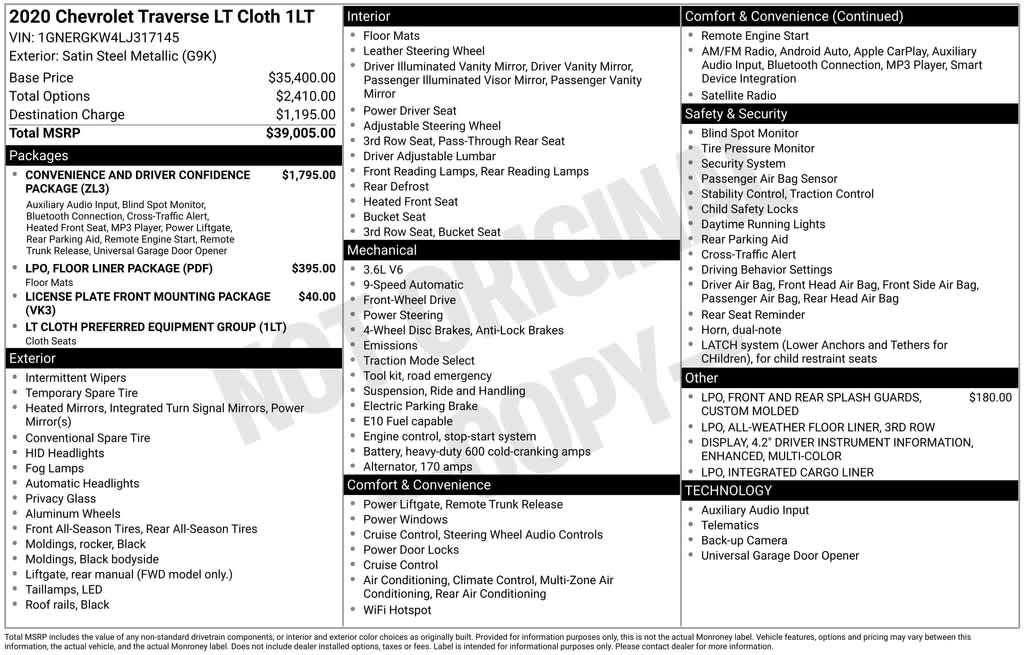 **Honda Presidents Award, Dealer Rater Dealership of the Year, CarFax Dealer of the Year and more!, REWARD YOURSELF TODAY!!, **CALL NOW 608.402.8200!!, WE WELCOME ALL TRADE-INS!!, **KBB Fair Trade sale, vehicle must be 2012 or newer and be in running condition., Besides many of the features just listed, this Chevrolet Traverse also may have many of the following;, Automatic temperature control, Rear Power Liftgate, Universal Home Remote, 1st & 2nd Row All-Weather Floor Liner (LPO), 3.49 Axle Ratio, 3rd Row All-Weather Floor Liner (LPO), 3rd row seats: split-bench, 4-Wheel Disc Brakes, 4.2 Multi-Color Enhanced Driver Instrument Display, 6 Speakers, 7-Passenger Seating (2-2-3 Seating Configuration), 8-Passenger Seating (2-3-3 Seating Configuration), ABS brakes, Air Conditioning, Alloy wheels, AM/FM radio: SiriusXM, Apple CarPlay/Android Auto, Brake assist, Bumpers: body-color, Compass, Convenience & Driver Confidence Package, Custom Molded Front & Rear Splash Guards (LPO), Delay-off headlights, Driver door bin, Driver vanity mirror, Dual front impact airbags, Dual front side impact airbags, Electronic Stability Control, Emergency communication system: OnStar and Chevrolet connected services capable, Floor Liner Package (LPO), Four wheel independent suspension, Front anti-roll bar, Front Bucket Seats, Front Center Armrest, Front dual zone A/C, Front fog lights, Front License Plate Bracket Mounting Package, Front reading lights, Fully automatic headlights, Heated door mirrors, Heated Driver & Front Passenger Seats, High-Intensity Discharge Headlights, Illuminated entry, Integrated Cargo Liner (LPO), Lane Change Alert w/Side Blind Zone Alert, Leather steering wheel, Low tire pressure warning, Occupant sensing airbag, Outside temperature display, Overhead airbag, Overhead console, Panic alarm, Passenger door bin, Passenger vanity mirror, Power door mirrors, Power driver seat, Power steering, Power windows, Preferred Equipment Group 1LT, Premium Cloth Seat Trim, Radio data system, Radio: Chevrolet Infotainment 3 Plus System, Radio: Chevrolet Infotainment System AM/FM Stereo, Rear air conditioning, Rear anti-roll bar, Rear Cross Traffic Alert, Rear Park Assist w/Audible Warning, Rear reading lights, Rear window defroster, Rear window wiper, Remote keyless entry, Remote Start, Roof rack: rails only, Security system, SiriusXM Radio, SiriusXM w/360L, Speed control, Speed-sensing steering, Spoiler, Steering wheel mounted audio controls, Tachometer, Telescoping steering wheel, Tilt steering wheel, Traction control, Trip computer, Turn signal indicator mirrors, Variably intermittent wipers, Voltmeter, Wheels: 18 Bright Silver Painted Aluminum, Automatic temperature control, Rear Power Liftgate, Universal Home Remote.