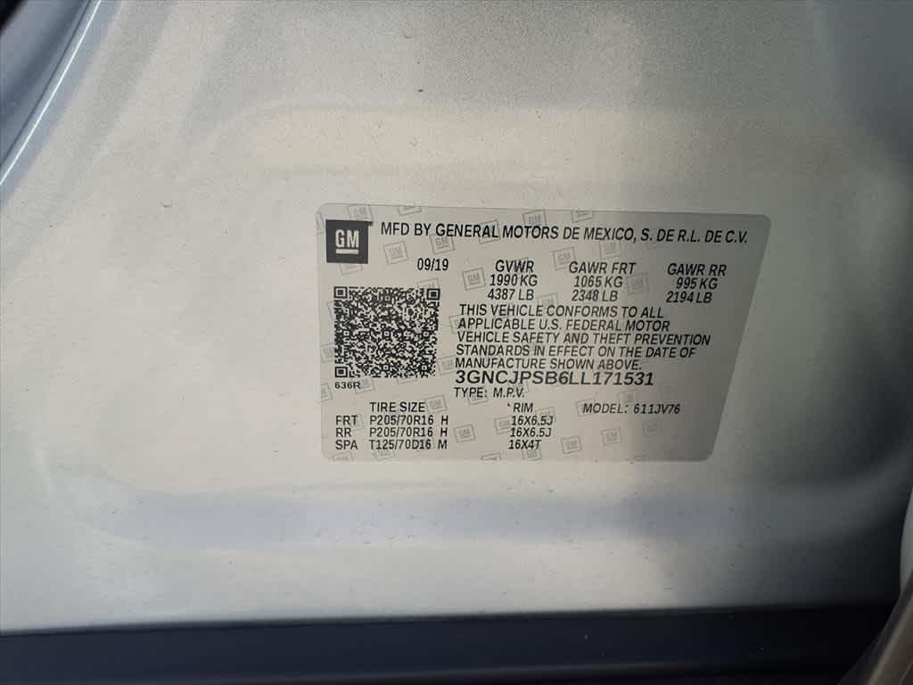 16 Aluminum Wheels, 2 Spare Keys Key System, 2 USB Ports w/Auxiliary Input Jack, 2-Way Manual Front Passenger Seat Adjuster, 3-Spoke Leather-Wrapped Steering Wheel, 3.53 Final Drive Axle Ratio, 4-Way Manual Driver Seat Adjuster, 4-Wheel Disc Brakes, 6 Speakers, 6-Speaker Audio System Feature, 6-Way Power Driver Seat Adjuster, ABS brakes, Air Conditioning, All-Wheel Drive Chassis, Alloy wheels, AM/FM radio: SiriusXM, Apple CarPlay/Android Auto, Body-Color Door Handles, Body-Color Door Handles w/Chrome Accent, Brake assist, Bumpers: body-color, Carpeted Cargo Mat (LPO), Compass, Delay-off headlights, Deluxe Cloth Seat Trim, Deluxe Cloth/Leatherette Seat Trim, Driver door bin, Driver vanity mirror, Drivers Seat Mounted Armrest, Dual front impact airbags, Dual front side impact airbags, Electronic Stability Control, Emergency communication system: OnStar and Chevrolet connected services capable, Exterior Parking Camera Rear, Front & Rear All Weather Floor Mats (LPO), Front anti-roll bar, Front Bucket Seats, Front Bucket Seats w/Driver Power Lumbar, Front reading lights, Front wheel independent suspension, Fully automatic headlights, Heated door mirrors, Illuminated entry, Interior Protection Package (LPO), Keyless Open, Keyless Start, Knee airbag, Low tire pressure warning, LT Convenience Package, Occupant sensing airbag, Outside temperature display, Overhead airbag, Panic alarm, Passenger door bin, Passenger vanity mirror, Power door mirrors, Power steering, Power windows, Preferred Equipment Group 1LT, Premium audio system: Chevrolet MyLink, Radio data system, Radio: Chevrolet Infotainment 3 System, Rear seat center armrest, Rear side impact airbag, Rear window defroster, Rear window wiper, Remote keyless entry, Roof rack: rails only, Security system, SiriusXM Radio, Speed control, Split folding rear seat, Spoiler, Steering wheel mounted audio controls, Tachometer, Telescoping steering wheel, Tilt steering wheel, Traction control, Trip computer, Variably intermittent wipers.