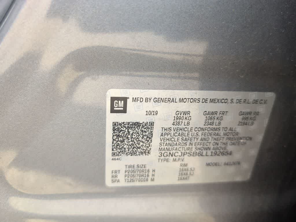 This Trax LT is nicely equipped with Preferred Equipment Group 1LT (All-Wheel Drive Chassis), 16 Aluminum Wheels, 2 USB Ports w/Auxiliary Input Jack, 2-Way Manual Front Passenger Seat Adjuster, 3.53 Final Drive Axle Ratio, 4-Way Manual Driver Seat Adjuster, 4-Wheel Disc Brakes, 6 Speakers, 6-Speaker Audio System Feature, ABS brakes, Air Conditioning, Alloy wheels, AM/FM radio: SiriusXM, Apple CarPlay/Android Auto, Body-Color Door Handles, Brake assist, Bumpers: body-color, Compass, Delay-off headlights, Deluxe Cloth Seat Trim, Driver door bin, Driver vanity mirror, Drivers Seat Mounted Armrest, Dual front impact airbags, Dual front side impact airbags, Electronic Stability Control, Emergency communication system: OnStar and Chevrolet connected services capable, Exterior Parking Camera Rear, Front anti-roll bar, Front Bucket Seats, Front Bucket Seats w/Driver Power Lumbar, Front License Plate Bracket, Front reading lights, Front wheel independent suspension, Fully automatic headlights, Heated door mirrors, Illuminated entry, Knee airbag, Low tire pressure warning, Occupant sensing airbag, Outside temperature display, Overhead airbag, Panic alarm, Passenger door bin, Passenger vanity mirror, Power door mirrors, Power steering, Power windows, Premium audio system: Chevrolet MyLink, Radio data system, Radio: Chevrolet Infotainment 3 System, Rear seat center armrest, Rear side impact airbag, Rear window defroster, Rear window wiper, Remote keyless entry, Roof rack: rails only, Security system, SiriusXM Radio, Speed control, Split folding rear seat, Spoiler, Steering wheel mounted audio controls, Tachometer, Telescoping steering wheel, Tilt steering wheel, Traction control, Trip computer, and Variably intermittent wipers. Price does not include licensing costs, registration fees, taxes and dealer doc fee of $899.50 which are to be paid by the consumer.