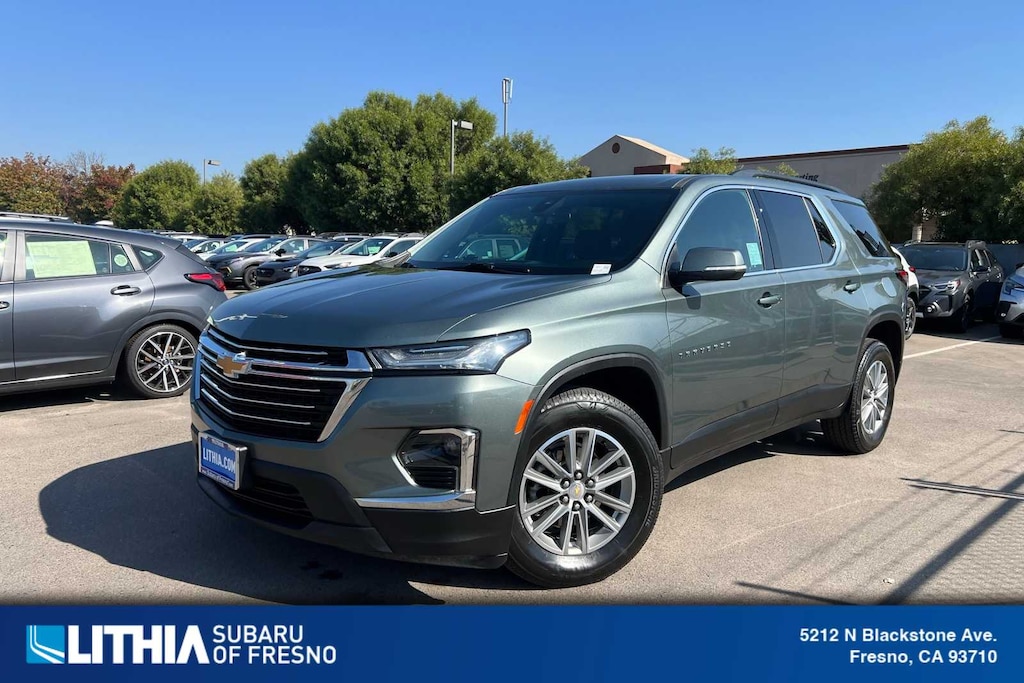 Silver Sage Metallic 2023 Chevrolet Traverse LT 1LT FWD 9-Speed Automatic 3.6L V6 SIDI VVT FRESH ENGINE and CABIN FILTERS, FRESH OIL CHANGE, 138 point Lithia inspected, DETAILED INTERIOR AND EXTERIOR FOR DELIVERY, CERTIFIED BY CARFAX - NO ACCIDENTS, CERTIFIED BY CARFAX - ONE OWNER, Multi Point Safety and Mechanical Inspection Performed by Certified Technician, 2-Way Manual Front Passenger Seat Adjuster, 3rd row seats: split-bench, 4-Wheel Disc Brakes, 4.2 Multi-Color Enhanced Driver Instrument Display, 6 Speakers, 6-Speaker Audio System Feature, 8-Way Power Driver Seat Adjuster, ABS brakes, Air Conditioning, AM/FM radio: SiriusXM, Apple CarPlay/Android Auto, Auto High-beam Headlights, Automatic temperature control, Black Roof Rails, Brake assist, Compass, Convenience & Driver Confidence Package, Electronic Stability Control, Emergency communication system, Exterior Parking Camera Rear, Four wheel independent suspension, Front anti-roll bar, Front Bucket Seats, Front dual zone A/C, Front License Plate Bracket Mounting Package, Fully automatic headlights, Heated door mirrors, Heated Driver & Front Passenger Seats, Leather steering wheel, Not Equipped w/Rear Park Assist (060), Outside temperature display, Power door mirrors, Power Driver Lumbar Control, Power driver seat, Power steering, Power windows, Preferred Equipment Group 1LT, Radio: Chevrolet Infotainment 3 Plus System, Radio: Chevrolet Infotainment System AM/FM Stereo, Rear air conditioning, Rear anti-roll bar, Rear Power Liftgate, Remote keyless entry, Remote Start, SiriusXM Radio, SiriusXM w/360L, Speed control, Speed-sensing steering, Spoiler, Steering wheel mounted audio controls, Telescoping steering wheel, Tilt steering wheel, Traction control, Turn signal indicator mirrors, Universal Home Remote.