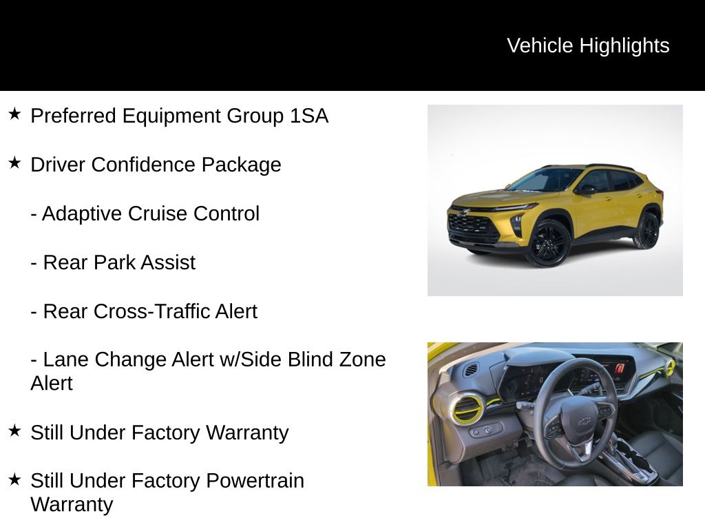 Clean CARFAX. 2024 Chevrolet Trax ACTIV Is nicely equipped with Driver Confidence Package (Adaptive Cruise Control, Lane Change Alert w/Side Blind Zone Alert, Rear Cross-Traffic Alert, and Rear Park Assist), Preferred Equipment Group 1SA, 2-Way Adjustable Front Head Restraints, 2-Way Power Driver Lumbar Seat Adjuster, 3.50 Final Drive Axle Ratio, 4-Way Manual Front Passenger Seat Adjuster, 4-Wheel Disc Brakes, 6 Speakers, 6-Speaker Audio System Feature, 8-Way Power Driver Seat Adjuster, ABS brakes, Air Conditioning, Alloy wheels, AM/FM radio: SiriusXM, Auto High-beam Headlights, Automatic temperature control, Brake assist, Bumpers: body-color, Compass, Delay-off headlights, Driver door bin, Driver vanity mirror, Dual front impact airbags, Dual front side impact airbags, Electronic Stability Control, Emergency communication system: OnStar and Chevrolet connected services capable, Evotex Seat Trim, Exterior Parking Camera Rear, Front & Rear All-Weather Floor Liners (LPO), Front anti-roll bar, Front Bucket Seats, Front Center Armrest, Front reading lights, Front wheel independent suspension, Fully automatic headlights, Heated door mirrors, Heated Driver & Front Passenger Seats, Heated front seats, Heated steering wheel, Illuminated entry, Jet Black Cargo Liner (LPO), Low tire pressure warning, Occupant sensing airbag, Outside temperature display, Overhead airbag, Overhead console, Panic alarm, Passenger door bin, Passenger vanity mirror, Power door mirrors, Power driver seat, Power steering, Power windows, Premium audio system: Chevrolet Infotainment 3, Radio data system, Radio: Audio System w/AM/FM, Rear Park Assist (DISC), Rear window defroster, Rear window wiper, Remote keyless entry, Security system, SiriusXM, Speed control, Split folding rear seat, Spoiler, Steering wheel mounted audio controls, Tachometer, Telescoping steering wheel, Tilt steering wheel, Traction control, Trip computer, Variably intermittent wipers, and Wheels: 18" Black-Painted Aluminum.