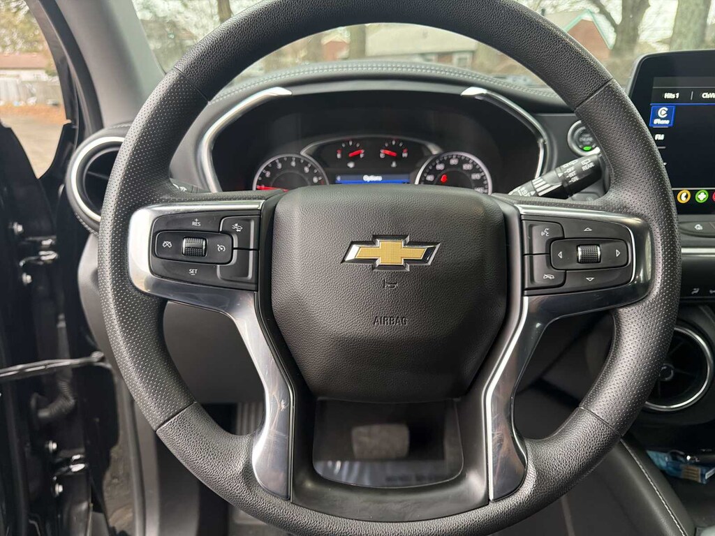 Blazer LT is nicely equipped with Preferred Equipment Group 2LT, Blazer LT, 4D Sport Utility, 2.0L Turbocharged, 9-Speed Automatic with Overdrive, AWD, Black, Jet Black/Maple Sugar w/Perforated Leather-Appointed Seat Trim, 170 Amp Alternator, 3.47 Final Drive Axle Ratio, 4-Way Manual Front Passenger Seat Adjuster, 4-Wheel Disc Brakes, 6 Speakers, 6-Speaker Audio System Feature, 8-Way Power Driver Seat Adjuster, ABS brakes, Air Conditioning, Alloy wheels, AM/FM radio: SiriusXM with 360L, Apple CarPlay/Android Auto, Auto High-beam Headlights, Automatic temperature control, Brake assist, Bumpers: body-color, Child-Seat-Sensing Airbag, Compass, Delay-off headlights, Driver door bin, Driver vanity mirror, Dual front impact airbags, Dual front side impact airbags, Electronic Stability Control, Emergency communication system: OnStar and Chevrolet connected services capable, Four wheel independent suspension, Front anti-roll bar, Front Bucket Seats, Front Center Armrest, Front dual zone A/C, Front reading lights, Fully automatic headlights, Heated door mirrors, Heated Driver and Front Passenger Seats, Heated front seats, Illuminated entry, Knee airbag, Leather Shift Knob, Low tire pressure warning, Occupant sensing airbag, Outside temperature display, Overhead airbag, Overhead console, Panic alarm, Passenger door bin, Passenger vanity mirror, Power door mirrors, Power Driver Lumbar Control, Power driver seat, Power steering, Power windows, Premium audio system: Chevrolet Infotainment 3 Plus, Premium Cloth Seat Trim, Radio data system, Radio: Chevrolet Infotainment 3 Plus System, Rear anti-roll bar, Rear reading lights, Rear seat center armrest, Rear window defroster, Rear window wiper, Remote keyless entry, Ride and Handling Suspension, Security system, SiriusXM with 360L, Speed control, Speed-sensing steering, Split folding rear seat, Spoiler, Steering wheel mounted audio controls, Stop-Start Engine Control System, Tachometer, Telescoping steering wheel, Tilt steering wheel, Traction control, Trip computer, Variably intermittent wipers, Voltmeter, and Wheels: : 18 Grazen Metallic Aluminum.