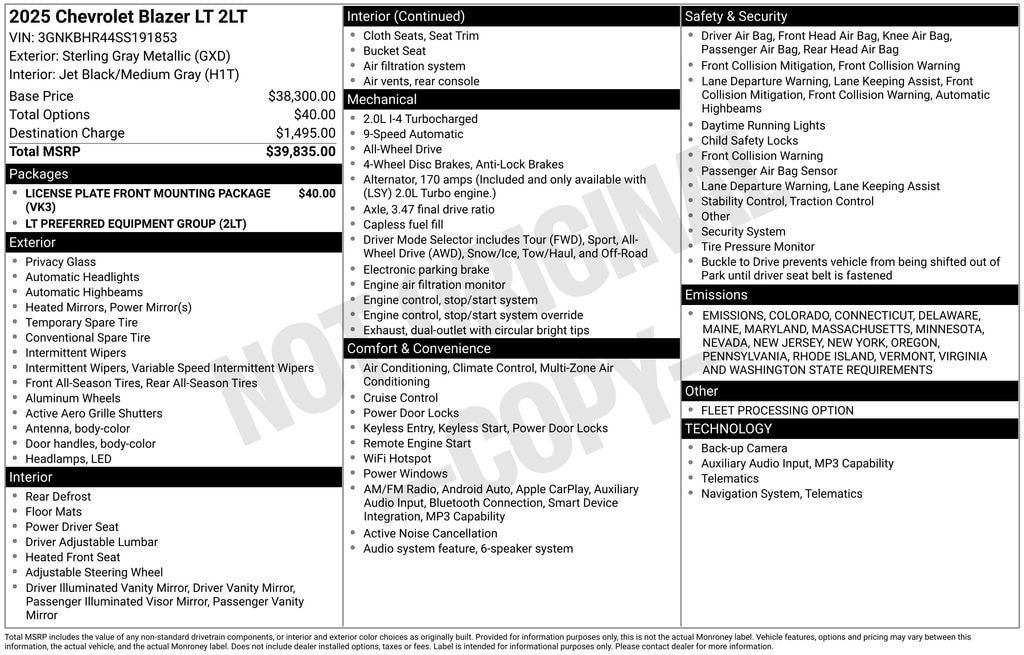 The 2025 Chevrolet Blazer LT is a versatile and capable SUV that combines style, performance, and advanced technology to elevate your driving experience. With its sleek exterior, powerful engine, and comprehensive suite of features, this Blazer is the perfect companion for your adventures, whether you're navigating the city streets or exploring the great outdoors. License Plate Front Mounting Package Preferred Equipment Group 2LT 6-Speaker Audio System Feature Radio: Chevrolet Infotainment 3 Plus System SiriusXM with 360L Automatic Temperature Control Rear Window Defroster Brake Assist Auto High-beam Headlights Delay-off Headlights Apple CarPlay/Android Auto Heated Driver and Front Passenger SeatsUnder the hood, the Blazer LT boasts a 2.0L Turbocharged engine mated to a 9-Speed Automatic with Overdrive transmission, delivering a responsive and efficient performance. With an impressive 22 MPG in the city and 27 MPG on the highway, this SUV strikes the perfect balance between power and fuel economy.The sleek and modern exterior of the Blazer LT is complemented by the Gray paint, giving it a sophisticated and timeless appearance. The 18 Grazen Metallic Aluminum wheels and rear window wiper add a touch of style and functionality, ensuring you can tackle any terrain with confidence.Step inside the Blazer LT and you'll be greeted by a wealth of premium features that cater to your every need. The 6-speaker audio system, Chevrolet Infotainment 3 Plus System, and SiriusXM with 360L provide an immersive entertainment experience, while the heated front seats and automatic temperature control keep you comfortable in any weather.Safety is a top priority in the Blazer LT, with features like ABS brakes, electronic stability control, and a suite of airbags to help protect you and your passengers. The OnStar and Chevrolet connected services provide an added layer of security and peace of mind.Whether you're commuting to the office, taking a road trip, or exploring the great outdoors, the 2025 Chevrolet Blazer LT is the perfect companion. Experience the perfect blend of style, performance, and technology by visiting our showroom today.Price does not include licensing costs, registration fees, taxes and dealer doc fee of $280, which are to be paid by the consumer.