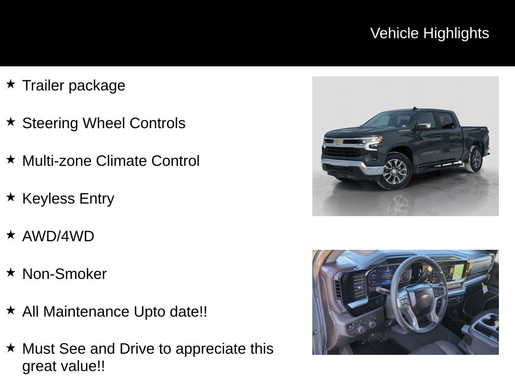 Clean CARFAX. 2026 Chevrolet Silverado 1500 LT Is nicely equipped with Convenience Package (120-Volt Interior Power Outlet, Dual-Zone Automatic Climate Control, Heated Steering Wheel, LED Cargo Area Lighting, Manual Tilt/Telescoping Steering Column, Wrapped Steering Wheel, and 120-Volt Bed Mounted Power Outlet), High Capacity Suspension Package, Standard Suspension Package, Trailering Package (Hitch Guidance), 8-Speed Automatic, 4WD, Black Cloth, 12.3" Multicolor Reconfigurable Digital Display, 3.42 Rear Axle Ratio, 4-Wheel Disc Brakes, 40/20/40 Front Split-Bench Seat, 6 Speakers, 6-Speaker Audio System, ABS brakes, Air Conditioning, All-Star Edition, Alloy wheels, AM/FM radio: SiriusXM with 360L, Apple CarPlay/Android Auto, Auto High-beam Headlights, Auto-Locking Rear Differential, Automatic Emergency Braking, Automatic temperature control, Bluetooth® For Phone, Brake assist, Bumpers: chrome, Chrome Mirror Caps, Cloth Seat Trim, Color-Keyed Carpeting Floor Covering, Compass, Deep-Tinted Glass, Delay-off headlights, Driver door bin, Driver vanity mirror, Dual front impact airbags, Dual front side impact airbags, Electric Rear-Window Defogger, Electronic Cruise Control, Electronic Stability Control, Emergency communication system: OnStar, Following Distance Indicator, Forward Collision Alert, Front anti-roll bar, Front Center Armrest w/Storage, Front dual zone A/C, Front Frame-Mounted Black Recovery Hooks, Front Pedestrian Braking, Front reading lights, Front wheel independent suspension, Fully automatic headlights, HD Rear Vision Camera, Heated door mirrors, Heated front seats, Heated steering wheel, Illuminated entry, Integrated Trailer Brake Controller, Low tire pressure warning, Occupant sensing airbag, OnStar Services Capable, Outside temperature display, Overhead airbag, Overhead console, Panic alarm, Passenger door bin, Passenger vanity mirror, Power door mirrors, Power driver seat, Power steering, Power windows, Premium audio system: Chevrolet Infotainment 3 Premium, Radio data system, Radio: Chevrolet Infotainment 3 Premium System, Rear reading lights, Rear step bumper, Rear window defroster, Remote keyless entry, Remote Vehicle Starter System, Security system, Speed control, Speed-sensing steering, Split folding rear seat, Steering Wheel Audio Controls, Steering wheel mounted audio controls, Tachometer, Teen Driver, Telescoping steering wheel, Tilt steering wheel, Tire Pressure Monitoring System, Traction control, Trip computer, Variably intermittent wipers, Voltmeter, Wheels: 18" x 8.5" Bright Silver Painted Aluminum, Wheels: 20" x 9" Painted Aluminum, and Wi-Fi Hot Spot Capable.