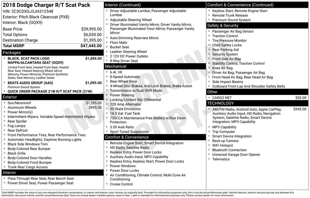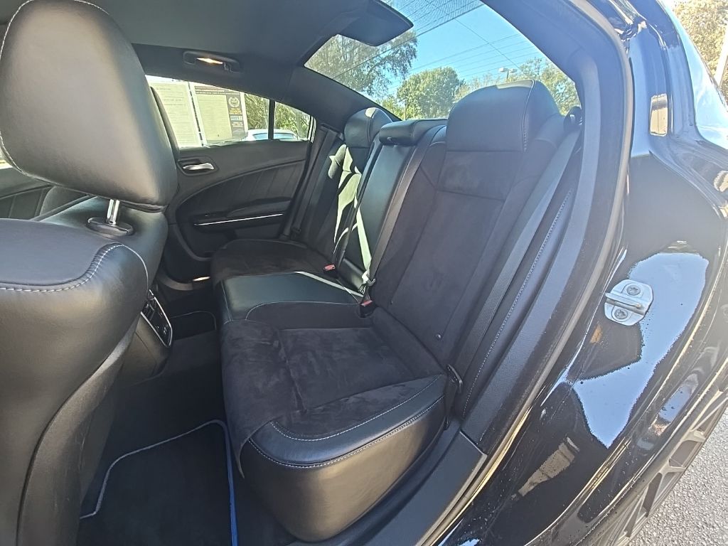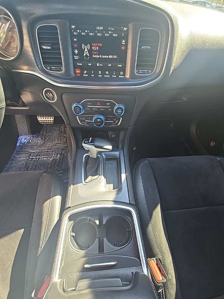 Charger R/T Scat Pack, 4D Sedan, SRT HEMI 6.4L V8 MDS, 8-Speed Automatic, RWD, Pitch Black Clearcoat, Black Artificial Leather, 1-Yr SiriusXM Guardian Trial, 10 Beats Premium Speakers w/Subwoofer, 4-Wheel Disc Brakes, 5-Year SiriusXM Traffic Service, 5-Year SiriusXM Travel Link Service, 552 Watt Amplifier, 6 Speakers, 8.4" Touchscreen Display, ABS brakes, Air Conditioning, Alloy wheels, AM/FM radio: SiriusXM, Anti-whiplash front head restraints, Apple CarPlay, Apple CarPlay/Android Auto, Auto-dimming Rear-View mirror, Automatic temperature control, Beats Audio Group, Brake assist, Bumpers: body-color, Cargo Net, Compass, Delay-off headlights, Driver door bin, Driver vanity mirror, Dual front impact airbags, Dual front side impact airbags, Electronic Stability Control, Emergency communication system: SiriusXM Guardian, For Details, Visit DriveUconnect.com, Four wheel independent suspension, Front anti-roll bar, Front Bucket Seats, Front Center Armrest, Front dual zone A/C, Front fog lights, Front reading lights, Fully automatic headlights, Garage door transmitter: HomeLink, Google Android Auto, GPS Antenna Input, GPS Navigation, HD Radio, Illuminated entry, Integrated Center Stack Radio, Integrated Voice Command w/Bluetooth, Knee airbag, Leather Shift Knob, Low tire pressure warning, Media Hub (2 USB, AUX), Occupant sensing airbag, Outside temperature display, Overhead airbag, Overhead console, Panic alarm, ParkView Rear Back-Up Camera, Passenger door bin, Passenger vanity mirror, Power door mirrors, Power driver seat, Power Driver/Passenger 4-Way Lumbar Adjust, Power Front Driver/Passenger Seats, Power passenger seat, Power steering, Power Sunroof, Power windows, Quick Order Package 21W R/T Scat Pack, Radio data system, Radio: Uconnect 4C Nav w/8.4" Display, Radio: Uconnect 4C w/8.4" Display, Rear anti-roll bar, Rear reading lights, Rear seat center armrest, Rear window defroster, Remote keyless entry, Rhombi 2-Pc Wheel Center Cap, Scat Pack Logo Cloth Seat, Security system, SiriusXM Satellite Radio, SiriusXM Traffic Plus, SiriusXM Travel Link, Speed control, Speed-Sensitive Wipers, Split folding rear seat, Spoiler, Sport steering wheel, Steering wheel mounted audio controls, Tachometer, Telescoping steering wheel, Tilt steering wheel, Traction control, Trip computer, USB Host Flip, Variably intermittent wipers, Wheels: 20" x 9.0" Alum Machined Face/Satin Black, Wheels: 20" x 9.0" Forged/Painted Aluminum.