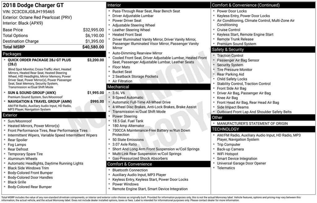 2018 Dodge Charger GT Is nicely equipped with Navigation & Travel Group (5-Year SiriusXM Traffic Service, 5-Year SiriusXM Travel Link Service, Radio: Uconnect 4C Nav w/8.4" Display, SiriusXM Traffic Plus, and SiriusXM Travel Link), Quick Order Package 28J GT Plus (300 HP Power Rating, Auto Adjust In Reverse Exterior Mirrors, Auto-Dimming Exterior Driver Mirror, Bi-Function HID Projector Head Lamps, Blind Spot & Cross Path Detection, Blind Spot Memory/Power/Heat Mirror, Driver & Passenger Lower LED Lamps, Exterior Mirrors Courtesy Lamps, Front Overhead LED Lighting, Gloss Black Fascia Applique, Heated 2nd Row Seats, Heated Steering Wheel, Illuminated Rear Cupholders, Nappa Leather Sport Seat, Performance Steering Wheel, Power Front Driver/Passenger Seats, R/T Front End Appearance, Radio/Driver Seat/Mirrors Memory, Security Alarm, Sport Mode, Steering Wheel Mounted Shift Control, Leather Trim Seats, Power Driver/Passenger 4-Way Lumbar Adjust, Rear Seat Armrest w/Storage Cupholder, and Ventilated Front Seats), Sun & Sound Group (10 Beats Premium Speakers w/Subwoofer, 552 Watt Amplifier, and Power Sunroof), AWD, Black Leather, Navigation System, 4-Wheel Disc Brakes, 6 Speakers, ABS brakes, Air Conditioning, Alloy wheels, AM/FM radio: SiriusXM, Anti-whiplash front head restraints, Apple CarPlay/Android Auto, Auto-dimming Rear-View mirror, Automatic temperature control, Brake assist, Bumpers: body-color, Cloth Sport Seat, Compass, Delay-off headlights, Driver door bin, Driver vanity mirror, Dual front impact airbags, Dual front side impact airbags, Electronic Stability Control, Emergency communication system: SiriusXM Guardian, Four wheel independent suspension, Front anti-roll bar, Front Bucket Seats, Front Center Armrest, Front dual zone A/C, Front fog lights, Front reading lights, Fully automatic headlights, Garage door transmitter: HomeLink, Heated door mirrors, Heated Front Seats, Heated front seats, Illuminated entry, Knee airbag, Leather Shift Knob, Low tire pressure warning, Manufacturer's Statement of Origin, Occupant sensing airbag, Outside temperature display, Overhead airbag, Overhead console, Panic alarm, ParkView Rear Back-Up Camera, Passenger door bin, Passenger vanity mirror, Power 4-Way Driver Lumbar Adjust, Power 8-Way Driver Seat, Power door mirrors, Power driver seat, Power steering, Power windows, Radio data system, Radio: Uconnect 4C w/8.4" Display, Rear anti-roll bar, Rear Armrest w/Cupholder Seat, Rear reading lights, Rear seat center armrest, Rear window defroster, Remote keyless entry, Speed control, Speed-Sensitive Wipers, Split folding rear seat, Spoiler, Steering wheel mounted audio controls, Tachometer, Telescoping steering wheel, Tilt steering wheel, Traction control, Trip computer, Variably intermittent wipers, and Wheels: 19" x 7.5" Painted Granite Crystal.
