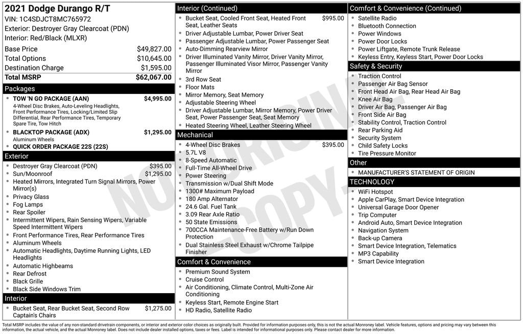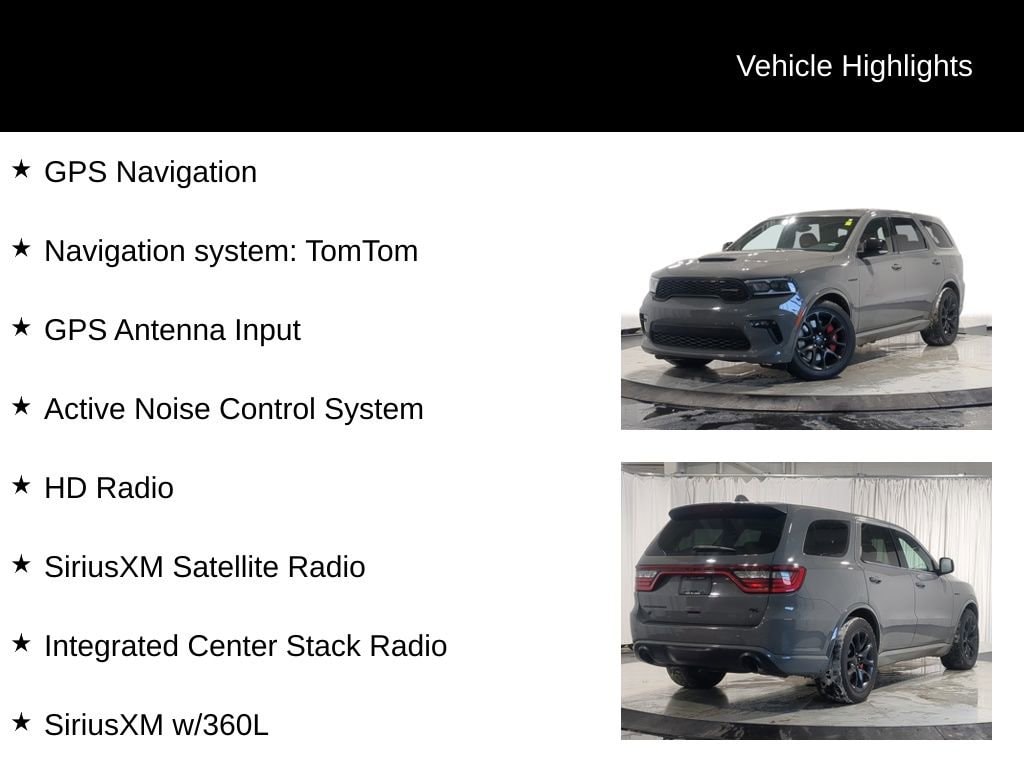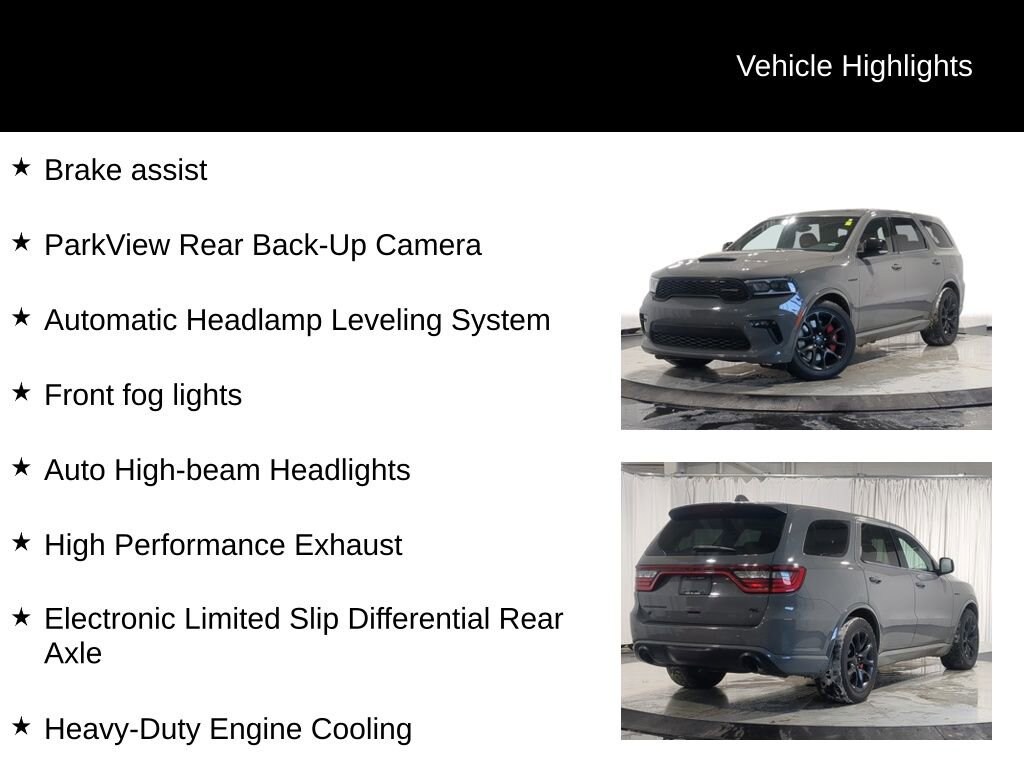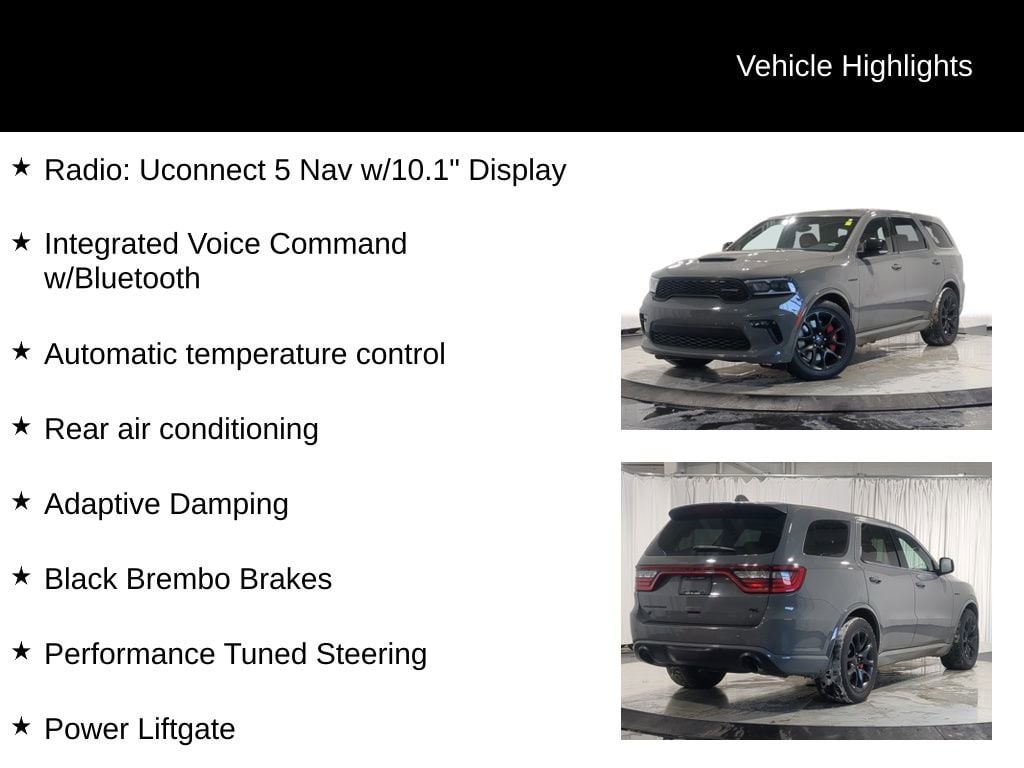 Experience the Commanding Presence of the 2021 Dodge Durango R/TThis 2021 Dodge Durango R/T is a true force to be reckoned with on the road. Boasting a powerful HEMI 5.7L V8 engine, advanced all-wheel-drive capabilities, and a host of premium features, this Durango is ready to elevate your driving experience. Tow 'N Go Package: Includes high-performance brakes, suspension, and exhaust for enhanced towing and handling Blacktop Package: Delivers a bold, aggressive look with black exterior accents 2nd Row Fold/Tumble Captain Chairs: Provide flexible seating for up to 6 passengers Red/Black Leather-Trimmed Bucket Seats: Offer premium comfort and style Ventilated Front Seats: Keep you cool and comfortable, even on the hottest days Adaptive Damping: Adjusts the suspension for a smooth, controlled ride Black Brembo Brakes: Deliver exceptional stopping power Performance Tuned Steering: Provides a responsive, connected driving feel Power Liftgate: Allows easy access to the spacious cargo area Rear Park Assist: Helps you maneuver with confidence in tight spaces Apple CarPlay and Android Auto: Keep you connected and entertained on the goThis Durango R/T is more than just a powerful SUV it's a statement. With its commanding presence, premium features, and impressive capabilities, it's the perfect choice for those who demand the best. Experience the thrill of the open road in this exceptional Dodge Durango.Price does not include licensing costs, registration fees, taxes and dealer doc fee of $280, which are to be paid by the consumer.