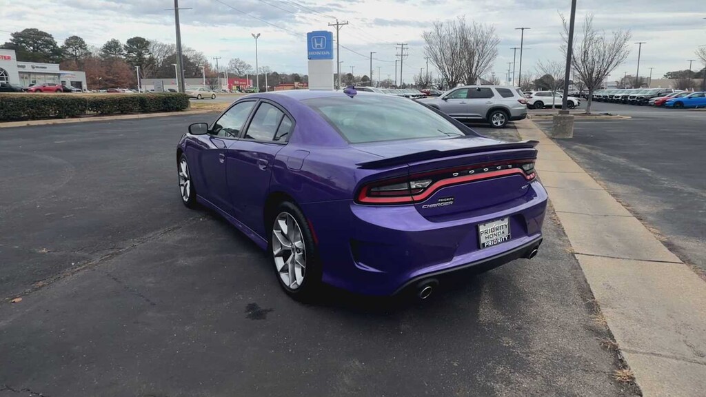 Charger GT is nicely equipped with Charger GT, 4D Sedan, 3.6L V6 24V VVT, 8-Speed Automatic, RWD, Plum Crazy Pearlcoat, 1-Yr SiriusXM Guardian Trial, 2-Piece Shark Fin Antenna, 4-Wheel Disc Brakes, 4G LTE Wi-Fi Hot Spot, 6 Speakers, 8.4 Touchscreen Display, ABS brakes, Air Conditioning, Alloy wheels, AM/FM radio: SiriusXM, Anti-whiplash front head restraints, Apple CarPlay, Apple CarPlay/Android Auto, Auto-dimming Rear-View mirror, Automatic temperature control, Brake assist, Bumpers: body-color, Cloth Performance Seats, Compass, Delay-off headlights, Driver door bin, Driver vanity mirror, Dual front impact airbags, Dual front side impact airbags, Electronic Stability Control, Emergency communication system: SiriusXM Guardian, For Details, Visit DriveUconnect.com, Four wheel independent suspension, Front anti-roll bar, Front Bucket Seats, Front Center Armrest, Front dual zone A/C, Front reading lights, Fully automatic headlights, Garage door transmitter: HomeLink, Google Android Auto, GPS Antenna Input, HD Radio, Heated door mirrors, Illuminated entry, Integrated Center Stack Radio, Integrated Voice Command w/Bluetooth, Knee airbag, Leather Shift Knob, Low tire pressure warning, Media Hub (2 USB, AUX), Occupant sensing airbag, Outside temperature display, Overhead airbag, Overhead console, Panic alarm, ParkView Rear Back-Up Camera, Passenger door bin, Passenger vanity mirror, Power 2-Way Driver Lumbar Adjust, Power 8-Way Driver Seat, Power door mirrors, Power driver seat, Power steering, Power windows, Radio: Uconnect 4C w/8.4 Display, Rear anti-roll bar, Rear Armrest w/Cupholder Seat, Rear reading lights, Rear seat center armrest, Rear window defroster, Remote keyless entry, Speed control, Speed-Sensitive Wipers, Split folding rear seat, Spoiler, Steering wheel mounted audio controls, Tachometer, Telescoping steering wheel, Tilt steering wheel, Traction control, Trip computer, USB Host Flip, Variably intermittent wipers, and Wheels: 20 x 8 Satin Carbon PainteD.