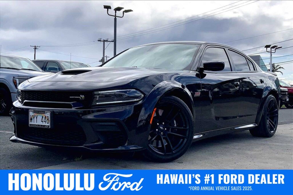 Check out this super rare, like-new Dodge Charger Scat Back WIDEBODY with only One-Owner! HONOLULU FORD! 808-532-1700, *DONT WAIT! CALL NOW!!, FINANCING AVAILABLE, GUARANTEED APPROVALS! LOW PAYMENTS! GREAT INTEREST RATES!, ***FORD CERTIFIED VEHICLE!! 172 POINT INSPECTION, OIL CHANGE, NEW WIPERS, NEW AIR FILTERS, FULL DET, WE SHIP TO NEIGHBOR ISLANDS!, 172 POINT INSPECTION BY FACTORY TRAINED TECHNICIANS!, APPLE CAR PLAY/ANDROID AUTO, ONE OWNER!!, ACCIDENT FREE CARFAX!, 6 Speakers, 8.4 Touchscreen Display, ABS brakes, Adaptive Damping Suspension (DISC), Air Conditioning, All Speed Traction Control, Alloy wheels, AM/FM radio: SiriusXM, Anti-whiplash front head restraints, Apple CarPlay, Apple CarPlay/Android Auto, Auto Adjust In Reverse Exterior Mirrors, Auto-Dimming Exterior Driver Mirror, Auto-dimming Rear-View mirror, Automatic temperature control, Black-Edged Premium Floormats, Blind Spot & Cross Path Detection, Blind Spot Memory/Power/Heat Mirror, Body Color Fender Flares, Brake assist, Brembo 6-Pot Fixed Front Caliper Brakes, Bumpers: body-color, Cloth Performance Seats w/Heat, Compass, Delay-off headlights, Driver & Passenger Lower LED Lamps, Driver door bin, Driver vanity mirror, Dual front impact airbags, Dual front side impact airbags, Electronic Stability Control, Emergency communication system: SiriusXM Guardian, Exterior Mirrors Courtesy Lamps, Exterior Mirrors w/Heating Element, Flat-Bottom Steering Wheel, For Details, Visit DriveUconnect.com, Four wheel independent suspension, Front anti-roll bar, Front Bucket Seats, Front Center Armrest, Front dual zone A/C, Front fog lights, Front License Plate Bracket, Front Overhead LED Lighting, Front reading lights, Fully automatic headlights, Garage door transmitter: HomeLink, Google Android Auto, GPS Antenna Input, HD Radio, Heated door mirrors, Heated Front Seats, Heated front seats, Heated steering wheel, Illuminated entry, Integrated Center Stack Radio, Integrated Voice Command w/Bluetooth, Knee airbag, Leather Shift Knob, Low tire pressure warning, Manufacturers Statement of Origin, Media Hub (2 USB, AUX), Occupant sensing airbag, Outside temperature display, Overhead airbag, Overhead console, Panic alarm, ParkView Rear Back-Up Camera, Passenger door bin, Passenger vanity mirror, Performance Shift Indicator, Plus Group, Power 2-Way Driver Lumbar Adjust, Power 2-Way Passenger Lumbar Adjust, Power door mirrors, Power driver seat, Power Front Driver/Passenger Seats, Power steering, Power Tilt/Telescope Steering Column, Power windows, Premium-Stitched Dash Panel, Quick Order Package 21V Scat Pack Widebody, Radio: Uconnect 4C w/8.4 Display, Radio/Driver Seat/Mirrors Memory, Rear anti-roll bar, Rear Armrest w/Cupholder Seat, Rear reading lights, Rear seat center armrest, Rear window defroster, Remote keyless entry, Scat Pack Logo Nappa/Alcantara Seat, Security system, Speed control, Speed-Sensitive Wipers, Split folding rear seat, Spoiler, Sport steering wheel, Steering wheel mounted audio controls, Tachometer, Telescoping steering wheel, Tilt steering wheel, Traction control, Trip computer, USB Host Flip, Variably intermittent wipers, Ventilated Front Seats, Wheels: 20 x 11 Carbon Black Aluminum, Wheels: 20 x 9 Lo Gloss Granite Crystal, Widebody Competition Suspension, Widebody Package, Scat Pack Widebody, Pirelli Tires, Black Artificial Leather. Recent Arrival! CARFAX One-Owner. Clean CARFAX. Pitch Black Clearcoat 2023 Dodge Charger R/T Scat Pack Widebody RWD 8-Speed Automatic SRT HEMI 6.4L V8 MDS