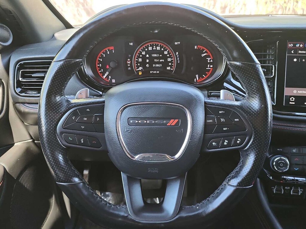 Our Accident Free, One Owner 2023 Dodge Durango GT Plus AWD in White Knuckle adds bold style to go with its sporty capability! Motivated by a 3.6 Liter Pentastar V6 providing 293hp to a paddle-shifted 8 Speed Automatic transmission. You can also score nearly 25mpg on the highway in this All Wheel Drive SUV, which shows its versatile performance with a Sport mode, a Class IV trailer hitch, and a rear load-leveling suspension. Our Durangos daring design displays a power sunroof, LED lighting, premium fog lamps, 20-inch alloy wheels, bright-tipped dual exhaust, and a power liftgate.