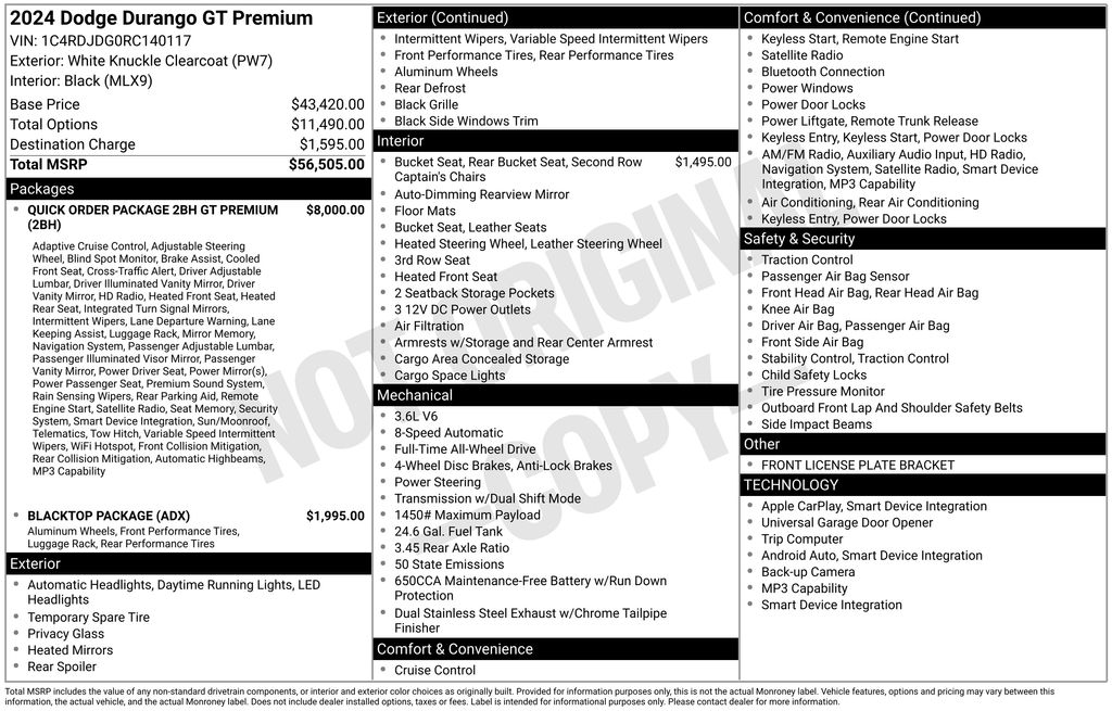 The Durango GT comes equipped with a host of premium features, including a 10.1" touchscreen display, 9 Alpine amplified speakers with a subwoofer, wireless charging pad, and a power sunroof. The advanced safety suite includes features like full-speed forward collision warning, lane departure warning, and blind spot monitoring, ensuring your peace of mind on the road.