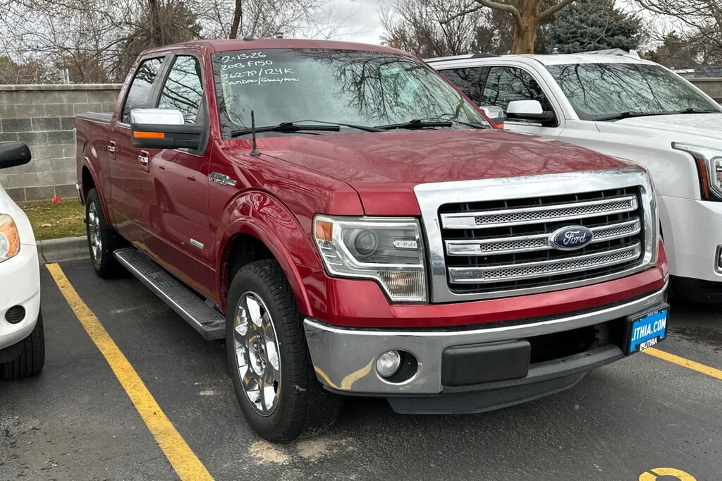 LUXURY EQUIPMENT GROUP rearview camera, reverse sensing system, remote start, pwr-folding heated exterior mirrors w/integrated turn signals & body-color skull caps, driver side auto-dimming exterior mirror, mirror memory, universal garage door opener, short visors w/covered illuminated mirrors, trailer brake controller, HID headlamps, pwr moonroof, Sony AM/FM stereo w/CD player, HD Radio, voice-activated navigation system w/in-dash screen & SD card for map/POI storage, integrated SiriusXM Travel Link, heated/cooled 10-way pwr leather-trimmed front bucket seats w/driver seat memory, flow-through console, floor shifter, 110-volt inverter, manual tilt/telescoping steering wheel, LARIAT CHROME PKG 18 chrome-clad aluminum wheels, chrome mesh grille insert, 6 chrome angular step bars, chrome exhaust tip, pwr-folding heated exterior mirrors w/integrated turn signals, mirror memory & chrome skull caps, body-color door handles w/chrome strap, 3.5L V6 ECOBOOST ENGINE, 20 6-SPOKE MACHINED ALUMINUM WHEELS, TAILGATE STEP. 2013 Ford F-150 with Ruby Red Metallic Tinted Clear Coat exterior and Pale Adobe interior features a V6 Cylinder Engine with 360 HP at 5500 RPM*.