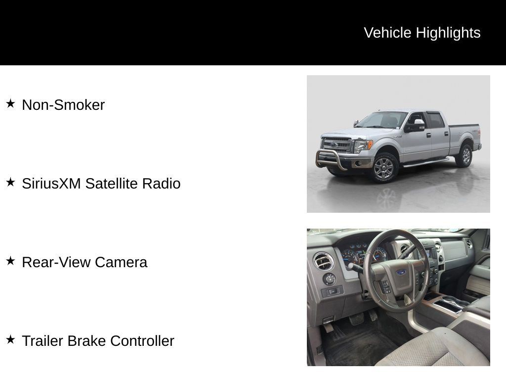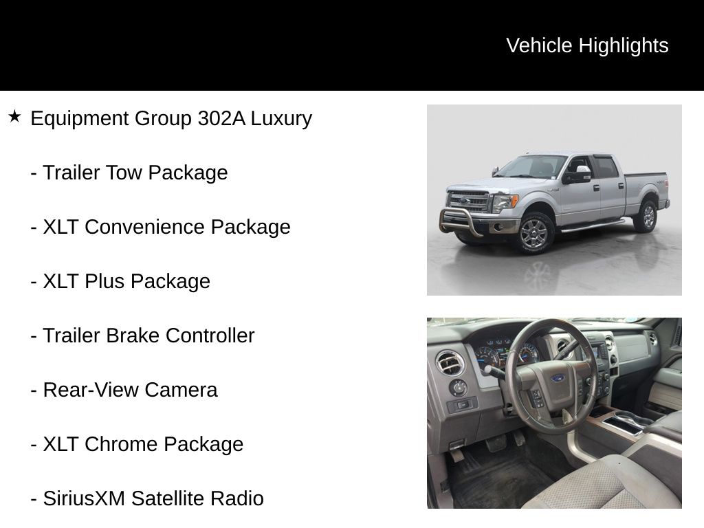 Recent Arrival! 2013 Ford F-150 XLT Is nicely equipped with Equipment Group 302A Luxury (Rear-View Camera, SiriusXM Satellite Radio, and Trailer Brake Controller), Trailer Tow Package (Auxiliary Transmission Oil Cooler, SelectShift Automatic Transmission, and Upgraded Radiator), XLT Chrome Package (18" Chrome-Clad Aluminum Wheels, 5" Chrome Running Boards, Chrome Door Handles w/Black Bezels, and Chrome Exhaust Tip), XLT Convenience Package (4.2" LCD Productivity Screen in Instrument Cluster, 6-Way Power Driver Seat, Heated Power Side Mirrors, Leather-Wrapped Steering Wheel, Power Adjustable Pedals, Self-Dimming Rear-View Mirror, and SYNC MyFord), XLT Plus Package (Power-Sliding Rear Window w/Defrost & Privacy Tint and Reverse Sensing System), GVWR: 7,350 lbs Payload Package, 4WD, 17" Machined-Aluminum w/Painted Accents Wheels, 4 Speakers, 4-Wheel Disc Brakes, ABS brakes, Air Conditioning, Alloy wheels, AM/FM radio, Bumpers: chrome, CD player, Cloth 40/20/40 Front Seat, Compass, Delay-off headlights, Driver door bin, Driver vanity mirror, Dual front impact airbags, Dual front side impact airbags, Electronic Stability Control, Front anti-roll bar, Front Center Armrest w/Storage, Front fog lights, Front reading lights, Front wheel independent suspension, Fully automatic headlights, Illuminated entry, Low tire pressure warning, Occupant sensing airbag, Outside temperature display, Overhead airbag, Overhead console, Panic alarm, Passenger door bin, Passenger vanity mirror, Power door mirrors, Power steering, Power windows, Radio data system, Radio: AM/FM Stereo/Clock/Single-CD, Rear reading lights, Rear step bumper, Remote keyless entry, Security system, Speed control, Speed-sensing steering, Split folding rear seat, Steering wheel mounted audio controls, SYNC, Tachometer, Tilt steering wheel, Traction control, and Variably intermittent wipers.
