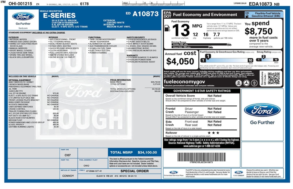 Oxford White 2014 Ford E-150 XL RWD 4-Speed Automatic with Overdrive 5.4L V8 EFI Flex Fuel Radio: ETR AM/FM Stereo/Single CD w/6 Speakers.