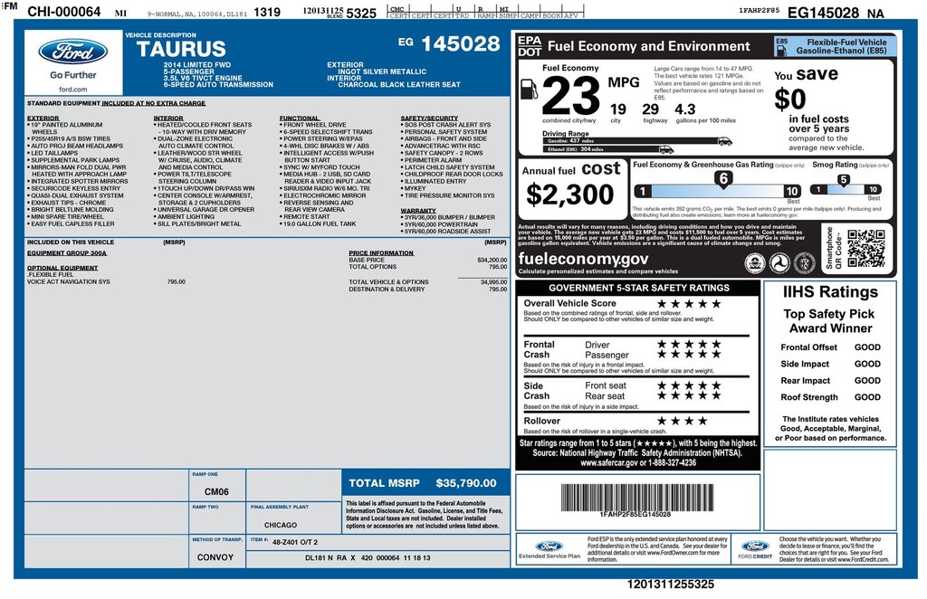 Clean CARFAX. 2014 Ford Taurus Limited Is nicely equipped with Equipment Group 300A, Voice Activated Navigation, 19" Premium Painted Aluminum Wheels, 4-Wheel Disc Brakes, 7 Speakers, ABS brakes, Air Conditioning, Alloy wheels, AM/FM radio: SiriusXM, AM/FM Stereo/Single CD/MP3 Capable, Auto tilt-away steering wheel, Auto-dimming Rear-View mirror, Automatic temperature control, Brake assist, Bumpers: body-color, CD player, Compass, Delay-off headlights, Driver door bin, Driver vanity mirror, Dual front impact airbags, Dual front side impact airbags, Electronic Stability Control, Exterior Parking Camera Rear, Four wheel independent suspension, Front anti-roll bar, Front Bucket Seats, Front Center Armrest, Front dual zone A/C, Front reading lights, Fully automatic headlights, Garage door transmitter: HomeLink, Heated & Cooled Perforated Leather Fr Bucket Seats, Heated door mirrors, Heated front seats, Illuminated entry, Leather steering wheel, Low tire pressure warning, Memory seat, Occupant sensing airbag, Outside temperature display, Overhead airbag, Overhead console, Panic alarm, Passenger door bin, Passenger vanity mirror, Power door mirrors, Power driver seat, Power passenger seat, Power steering, Power windows, Radio data system, Rear anti-roll bar, Rear Parking Sensors, Rear reading lights, Rear seat center armrest, Rear window defroster, Remote keyless entry, Security system, Speed control, Speed-sensing steering, Speed-Sensitive Wipers, Split folding rear seat, Steering wheel memory, Steering wheel mounted audio controls, SYNC w/MyFord Touch & SYNC Services, Tachometer, Telescoping steering wheel, Tilt steering wheel, Traction control, Trip computer, Variably intermittent wipers, and Ventilated front seats.