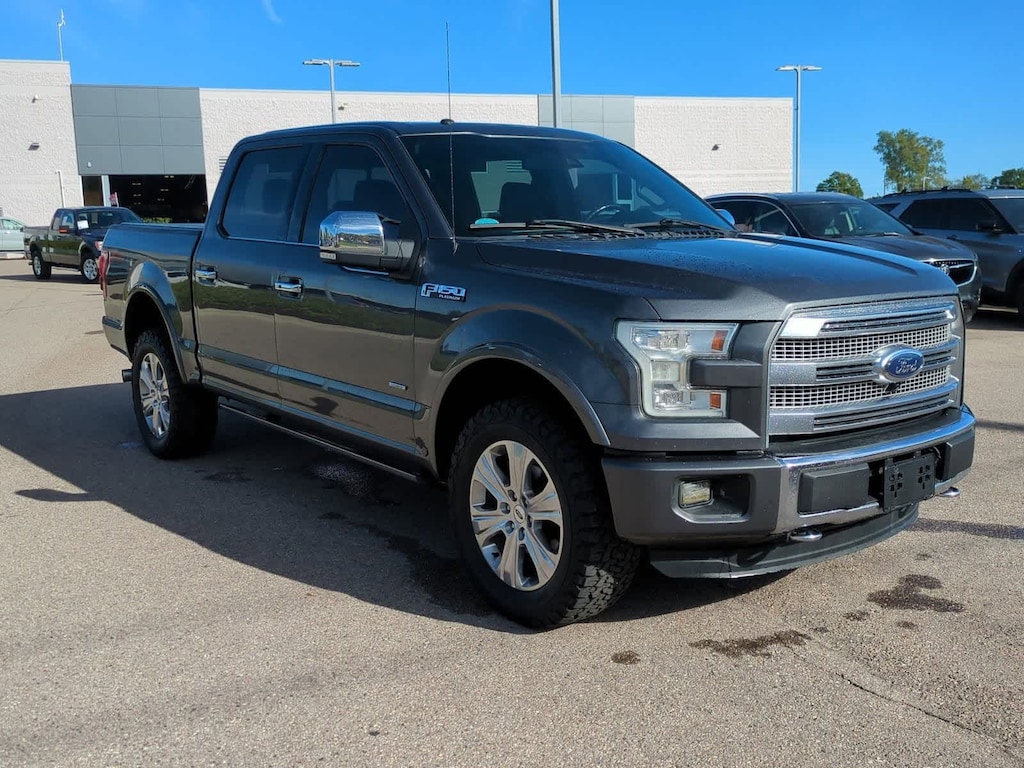 2015 Ford F-150 Platinum Magnetic Metallic 4WD 20 Polished Aluminum Wheels, 4x4 FX4 Off-Road Decal, AM/FM radio: SiriusXM, Auto High-beam Headlights, Automatic temperature control, Auxiliary Transmission Oil Cooler, Black Unique Multi-Contour Leather Bucket Seats, Class IV Trailer Hitch Receiver, Electronic Locking w/3.55 Axle Ratio, Equipment Group 700A, Front & Rear Off-Road Tuned Shock Absorbers, Front dual zone A/C, Front fog lights, Fully automatic headlights, FX4 Off-Road Package, GVWR: 7,050 lbs Payload Package, Heated front seats, Heated rear seats, Hill Descent Control, Integrated Trailer Brake Controller, Lane-Keeping System, Max Trailer Tow Package, Memory seat, Navigation System, Power driver seat, Power passenger seat, Premium audio system: Sony, Radio: Sony Single CD w/HD & SiriusXM Satellite, Rear Parking Sensors, Steering wheel mounted audio controls, SYNC with MyFord Touch, Technology Package, Trailer Tow Package, Turn signal indicator mirrors, Twin Panel Moonroof, Upgraded Front Stabilizer Bar, Voice-Activated Navigation.