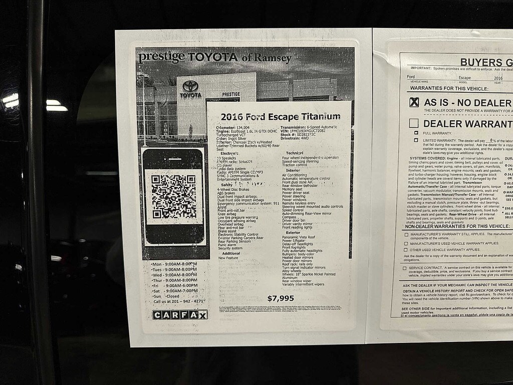 This 2016 Ford Escape Titanium will not make it to the weekend!! CALL NOW to reserve your test drive!! (844) 838-7075 Please Visit www.PrestigeToyota.com for further details. Price does not include licensing costs, registration fees, taxes and dealer doc fee of $999 which are to be paid by the consumer.