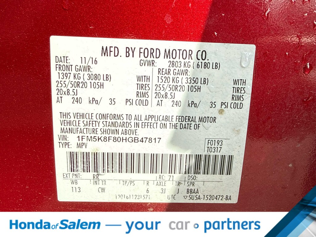 Leather Seats, Third Row Seat, Navigation, Power Liftgate, Rear Air, Heated Driver Seat, Heated Rear Seat, Cooled Driver Seat, Back-Up Camera, Premium Sound System, Satellite Radio, iPod/MP3 Input, Onboard Communications System, Aluminum Wheels, Remote Engine Start Rear Spoiler, MP3 Player, Remote Trunk Release, Keyless Entry, Privacy Glass. Ford Limited with Ruby Red Metallic Tinted Clearcoat exterior and Ebony Black interior features a V6 Cylinder Engine with 280 HP at 5600 RPM*.