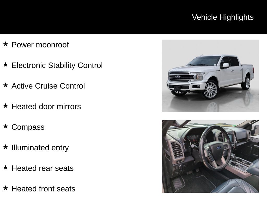 2018 Ford F-150 Limited Is nicely equipped with GVWR: 6,750 lbs Payload Package, 4WD, ABS brakes, Active Cruise Control, Alloy wheels, Compass, Electronic Stability Control, Front dual zone A/C, Heated door mirrors, Heated front seats, Heated rear seats, Illuminated entry, Low tire pressure warning, Navigation System, Power moonroof, Remote keyless entry, Traction control, 10 Speakers, 22" Polished Aluminum Wheels, 3.31 Axle Ratio, 4-Wheel Disc Brakes, Adjustable pedals, Air Conditioning, AM/FM radio: SiriusXM, AppLink/Apple CarPlay and Android Auto, Auto High-beam Headlights, Auto tilt-away steering wheel, Auto-dimming door mirrors, Auto-dimming Rear-View mirror, Automatic temperature control, Brake assist, Bumpers: body-color, CD player, Class IV Trailer Hitch Receiver, Delay-off headlights, Driver door bin, Driver vanity mirror, Dual front impact airbags, Dual front side impact airbags, Emergency communication system: SYNC 3 911 Assist, Exterior Parking Camera Rear, Front anti-roll bar, Front Bucket Seats, Front Center Armrest, Front fog lights, Front reading lights, Front wheel independent suspension, Fully automatic headlights, Garage door transmitter, Genuine wood door panel insert, Heated steering wheel, Memory seat, Occupant sensing airbag, Outside temperature display, Overhead airbag, Overhead console, Panic alarm, Passenger door bin, Passenger vanity mirror, Pedal memory, Power door mirrors, Power driver seat, Power passenger seat, Power steering, Power windows, Radio data system, Radio: B&O Play Premium Audio System, Rain sensing wipers, Rear reading lights, Rear seat center armrest, Rear step bumper, Rear window defroster, Security system, Speed control, Speed-sensing steering, Split folding rear seat, Steering wheel memory, Steering wheel mounted audio controls, SYNC 3, Tachometer, Telescoping steering wheel, Tilt steering wheel, Trip computer, Turn signal indicator mirrors, Unique Leather Bucket Seats, Variably intermittent wipers, Ventilated front seats, Voice-Activated Touchscreen Navigation System, and Voltmeter.