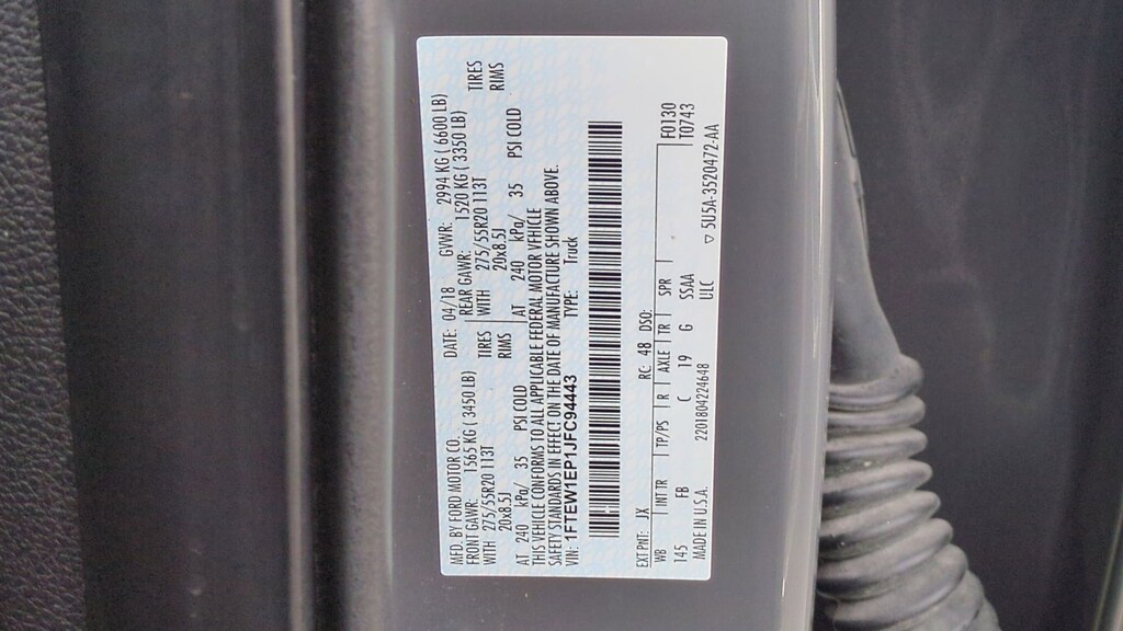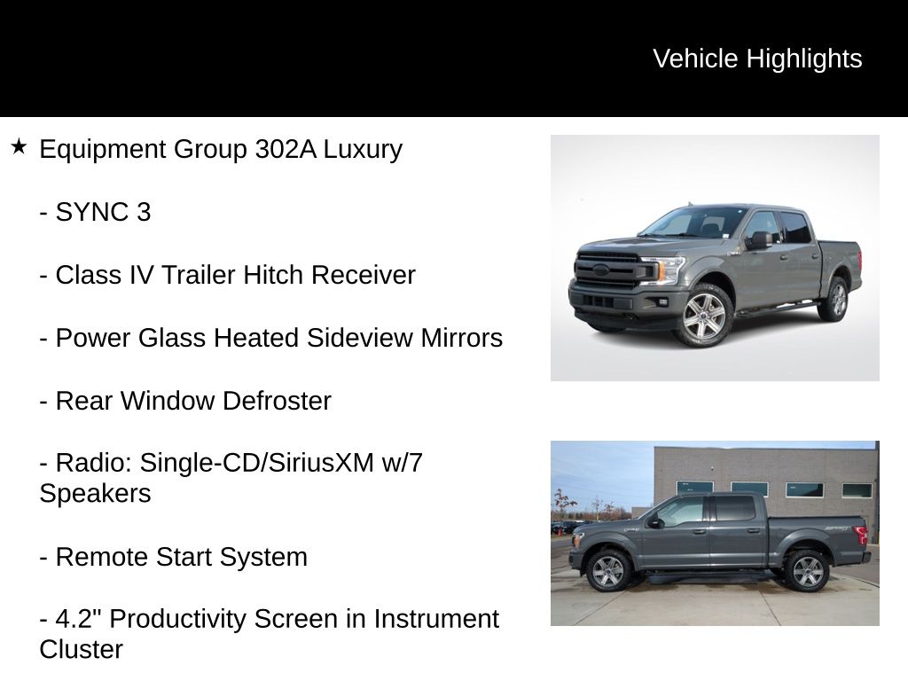 Clean CARFAX. 2018 Ford F-150 XLT Is nicely equipped with Equipment Group 302A Luxury (10-Way Power Driver & Passenger Seats, 4.2" Productivity Screen in Instrument Cluster, Class IV Trailer Hitch Receiver, Cloth 40/20/40 Front Seat, Fixed Backlight w/Privacy Glass, Heated Front Seats, Leather-Wrapped Steering Wheel, Power Glass Heated Sideview Mirrors, Power-Adjustable Pedals, Radio: Single-CD/SiriusXM w/7 Speakers, Rear Under-Seat Storage, Rear Window Defroster, Remote Start System, Reverse Sensing System, SYNC 3, Auto-Dimming Rear-View Mirror, and SYNC), XLT Power Equipment Group (LED Box Lighting and Power-Sliding Rear Window), XLT Sport Appearance Package (2-Bar Style Grille w/2 Minor Bars Painted Dark, Accent-Color Step Bars, Body-Color Door & Tailgate Handles, Body-Color Front & Rear Bumpers, Box Side Decals, Single-Tip Chrome Exhaust, and Wheels: 18" 6-Spoke Machined-Aluminum), GVWR: 6,500 lbs Payload Package, GVWR: 6,600 lbs Payload Package, 4WD, Navigation System, Wheels: 20" 6-Spoke Premium Painted Aluminum, 110V/400W Outlet, 4-Wheel Disc Brakes, 6 Speakers, 8-Way Power Driver Seat, ABS brakes, Air Conditioning, Alloy wheels, AM/FM radio, Brake assist, Bumpers: chrome, CD player, Compass, Delay-off headlights, Driver door bin, Driver vanity mirror, Drop-In Bedliner (Pre-Installed), Dual front impact airbags, Dual front side impact airbags, Electronic Stability Control, Emergency communication system: 911 Assist, Exterior Parking Camera Rear, Front anti-roll bar, Front Center Armrest w/Storage, Front fog lights, Front reading lights, Front wheel independent suspension, Fully automatic headlights, Illuminated entry, Low tire pressure warning, Occupant sensing airbag, Outside temperature display, Overhead airbag, Panic alarm, Passenger door bin, Passenger vanity mirror, Power door mirrors, Power steering, Power windows, Radio data system, Radio: AM/FM Stereo/Single-CD Player, Rear reading lights, Rear step bumper, Remote keyless entry, Security system, Soft Folding Tonneau Box Cover (Dealer Installed), Speed control, Speed-sensing steering, Split folding rear seat, Steering wheel mounted audio controls, Tachometer, Telescoping steering wheel, Tilt steering wheel, Traction control, Variably intermittent wipers, Voice-Activated Touchscreen Navigation System, and Voltmeter.