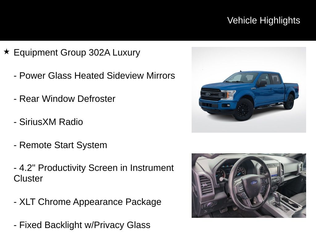 Clean CARFAX. 2019 Ford F-150 XLT Is nicely equipped with Equipment Group 302A Luxury (10-Way Power Driver & Passenger Seats, 4.2" Productivity Screen in Instrument Cluster, Cloth 40/20/40 Front Seat, Fixed Backlight w/Privacy Glass, Heated Front Seats, Leather-Wrapped Steering Wheel, Power Glass Heated Sideview Mirrors, Power-Adjustable Pedals, Rear Under-Seat Storage, Rear Window Defroster, Remote Start System, and SiriusXM Radio), FX4 Off-Road Package (4x4 FX4 Off-Road Bodyside Decal, Hill Descent Control, Off-Road Tuned Front Shock Absorbers, and Tray Style Floor Liner), XLT Sport Appearance Package (2-Bar Style Grille w/2 Minor Bars Painted Dark, Accent-Color Step Bars, Body-Color Door & Tailgate Handles, Body-Color Front & Rear Bumpers, Box Side Decals, and Wheels: 18" 6-Spoke Machined-Aluminum), GVWR: 6,600 lbs Payload Package, 4WD, 3.55 Axle Ratio, 4-Wheel Disc Brakes, ABS brakes, Air Conditioning, Auto High-beam Headlights, Brake assist, Class IV Trailer Hitch Receiver, Compass, Delay-off headlights, Driver door bin, Dual front impact airbags, Dual front side impact airbags, Electronic Stability Control, Exterior Parking Camera Rear, Front anti-roll bar, Front wheel independent suspension, Fully automatic headlights, Low tire pressure warning, Occupant sensing airbag, Outside temperature display, Overhead airbag, Passenger door bin, Passenger vanity mirror, Power steering, Radio: AM/FM Stereo w/6 Speakers, Rear step bumper, Speed-sensing steering, Split folding rear seat, SYNC 3, Tachometer, Telescoping steering wheel, Tilt steering wheel, Traction control, Variably intermittent wipers, and Voltmeter.
