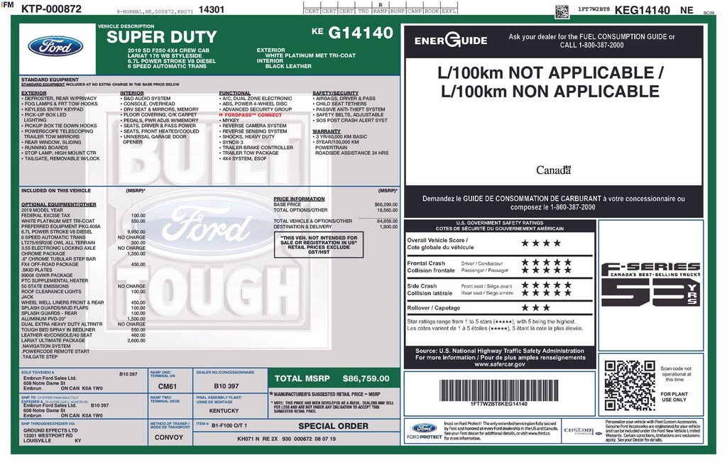 Clean CARFAX. 2019 Ford F-250SD Lariat Is nicely equipped with Chrome Package (6" Angular Chrome Step Bars, Body-Color Door Handles w/Chrome Insert, Chrome Exhaust Tip, Unique Chrome Mirror Caps, and Wheels: 18" Chrome PVD Aluminum), FX4 Off-Road Package (Hill Descent Control, Off-Road Specifically Tuned Shock Absorbers, and Unique FX4 Off-Road Box Decal), GVWR: 10,000 lb Payload Package, Lariat Ultimate Package (Ambient Lighting - Fixed Color, Automatic High Beam, Easy Entry®/Exit Memory Driver's Seat Feature, Intelligent Access w/Push-Button Start, LED Box Lighting, Memory Power-Adjustable Pedals, Power Heated/Cooled Driver Seat w/Memory, Power Heated/Cooled Passenger Seat, Power Telescoping/Tilt Steering Wheel/Column, PowerScope Trailer Tow Mirrors w/Memory, Remote Start System, Remote Tailgate Release, Tailgate Step & Handle, and Voice-Activated Navigation), 4WD, ABS brakes, Alloy wheels, Compass, Electronic Stability Control, Front dual zone A/C, Heated door mirrors, Illuminated entry, Low tire pressure warning, Remote keyless entry, Traction control, 10 Speakers, 110V/400W Outlet, 3.73 Axle Ratio, 4-Wheel Disc Brakes, Adjustable pedals, Air Conditioning, AM/FM radio: SiriusXM, AppLink/Apple CarPlay and Android Auto, Auto-dimming Rear-View mirror, Automatic temperature control, Brake assist, Bumpers: chrome, Delay-off headlights, Driver door bin, Driver vanity mirror, Dual front impact airbags, Dual front side impact airbags, Emergency communication system: SYNC 3 911 Assist, Exterior Parking Camera Rear, Flow-Through Console, Front anti-roll bar, Front Bucket Seats, Front Center Armrest, Front fog lights, Front Leather Seating Surfaces 40/Console/40, Front reading lights, Fully automatic headlights, Leather steering wheel, Outside temperature display, Overhead airbag, Overhead console, Panic alarm, Passenger door bin, Passenger vanity mirror, Power door mirrors, Power driver seat, Power passenger seat, Power steering, Power windows, Radio data system, Radio: B&O Sound System by Bang & Olufsen, Rear Parking Sensors, Rear reading lights, Rear seat center armrest, Rear step bumper, Rear window defroster, Security system, SiriusXM Radio, Speed control, Split folding rear seat, Steering wheel mounted audio controls, SYNC 3 Communications & Entertainment System, Tachometer, Telescoping steering wheel, Tilt steering wheel, Trip computer, Turn signal indicator mirrors, Variably intermittent wipers, and Wheels: 18" Bright Machined Cast Aluminum.