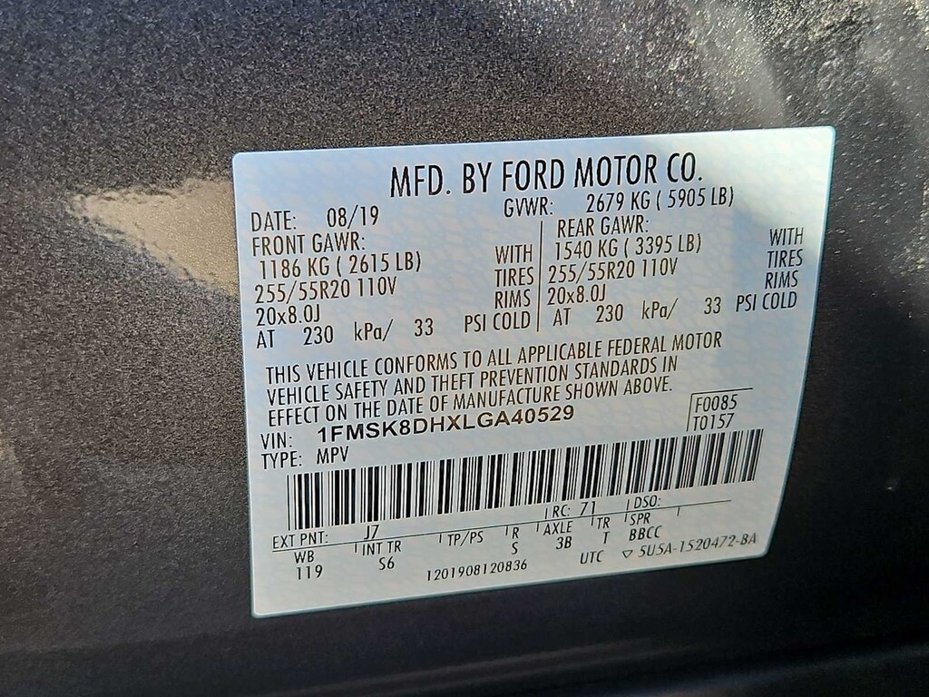 1st & 2nd Row Heated Seats, 20 Premium Painted Aluminum Wheels, 3.58 Non-Limited-Slip Rear Axle Ratio, 3rd row seats: bench, 4-Wheel Disc Brakes, 6 Speakers, ABS brakes, ActiveX Captains Chairs, Air Conditioning, Alloy wheels, AM/FM radio: SiriusXM, AM/FM Stereo, Auto High-beam Headlights, Automatic temperature control, Brake assist, Bumpers: body-color, Class III Trailer Tow Package, Comfort Package, Compass, Delay-off headlights, Driver door bin, Driver vanity mirror, Dual front impact airbags, Dual front side impact airbags, Electronic Stability Control, Emergency communication system: SYNC 3 911 Assist, Equipment Group 202A, Evasive Steering Assist, Exterior Parking Camera Rear, Ford Co-Pilot360 Assist+, FordPass Connect, Four wheel independent suspension, Front anti-roll bar, Front Bucket Seats, Front Center Armrest, Front dual zone A/C, Front reading lights, Fully automatic headlights, Heated door mirrors, Heated Steering Wheel, Illuminated entry, Intelligent Adaptive Cruise Control, Knee airbag, Leather steering wheel, LED Fog Lamps, Low tire pressure warning, Occupant sensing airbag, Outside temperature display, Overhead airbag, Overhead console, Panic alarm, Passenger door bin, Passenger vanity mirror, Power door mirrors, Power driver seat, Power Liftgate, Power passenger seat, Power steering, Power windows, Rear air conditioning, Rear anti-roll bar, Rear reading lights, Rear window defroster, Rear window wiper, Remote keyless entry, Remote Start System, Roof rack: rails only, Security system, Speed control, Speed-sensing steering, Speed-Sensitive Wipers, Split folding rear seat, Spoiler, Steering wheel mounted audio controls, SYNC 3 Communications & Entertainment System, SYNC 3/Apple CarPlay/Android Auto, Tachometer, Telescoping steering wheel, Tilt steering wheel, Traction control, Trip computer, Twin Panel Moonroof, Unique Cloth Captains Chairs, Variably intermittent wipers, Voice-Activated Touchscreen Navigation System, Wheels: 18 5-Spoke Sparkle Silver-Painted Alum.