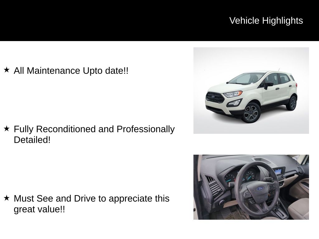 Recent Arrival! Clean CARFAX. 2021 Ford EcoSport S Is nicely equipped with Equipment Group 100A, 3.51 Axle Ratio, 4-Wheel Disc Brakes, 6 Speakers, ABS brakes, Air Conditioning, Alloy wheels, AM/FM radio, Brake assist, Bumpers: body-color, Cloth Front Bucket Seats, Compass, Delay-off headlights, Driver door bin, Driver vanity mirror, Dual front impact airbags, Dual front side impact airbags, Electronic Stability Control, Emergency communication system, Exterior Parking Camera Rear, Front anti-roll bar, Front Bucket Seats, Front Center Armrest, Front reading lights, Front wheel independent suspension, Fully automatic headlights, Illuminated entry, Knee airbag, Low tire pressure warning, Occupant sensing airbag, Outside temperature display, Overhead airbag, Overhead console, Panic alarm, Passenger door bin, Passenger vanity mirror, Power door mirrors, Power steering, Power windows, Radio data system, Radio: AM/FM/MP3 Stereo, Rear anti-roll bar, Rear seat center armrest, Rear side impact airbag, Rear window defroster, Rear window wiper, Remote keyless entry, Speed control, Speed-sensing steering, Split folding rear seat, Steering wheel mounted audio controls, SYNC Communications & Entertainment System, Tachometer, Telescoping steering wheel, Tilt steering wheel, Traction control, Trip computer, Variably intermittent wipers, and Wheels: 16" Low-Gloss Magnetic-Painted.