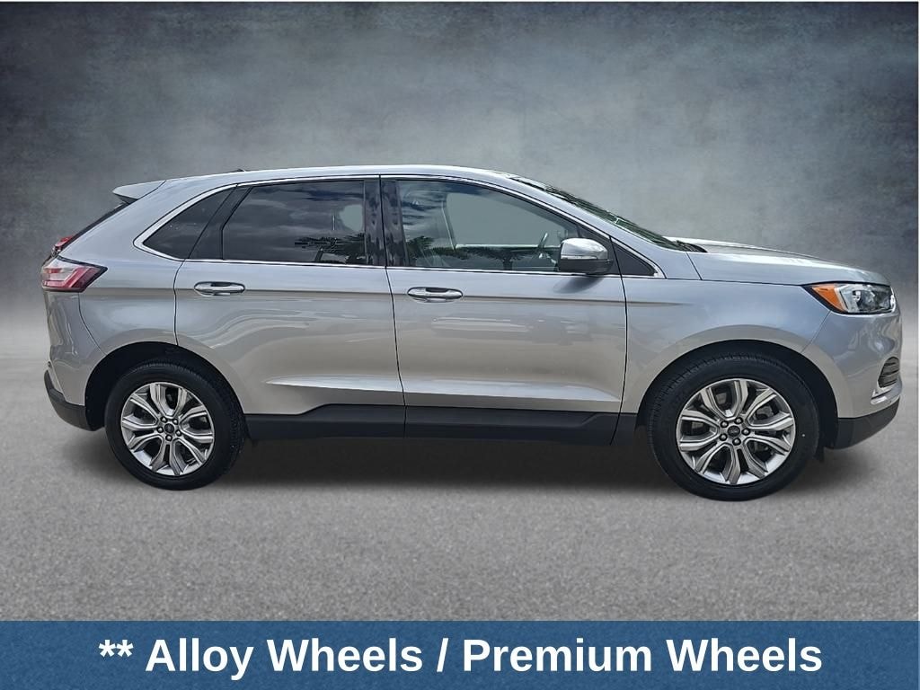 ** Adaptive cruise control, ** Alloy Wheels / Premium Wheels, ** Apple CarPlay/Android Auto, ** Backup Camera, ** Blind Spot Monitor, ** Bluetooth, Hands-Free, ** Brake Assist, ** Cruise Control, ** Heated Seats, ** Keyless Entry, ** Keyless Start, ** Lane Departure Warning, ** Leather Seats, ** LED Headlights, ** Navigation System, ** Premium Sound System / DVD Player, ** Rear Cross Traffic Alert, ** Security System, ** Stability Control, ** Steering Wheel Controls, ** USB Port, Edge Titanium, 4D Sport Utility, EcoBoost 2.0L I4 GTDi DOHC Turbocharged VCT, 8-Speed Automatic, AWD, Silver Metallic, Ebony Leather, 12 Speakers, 3.80 Axle Ratio, 4-Wheel Disc Brakes, ABS brakes, Air Conditioning, Alloy wheels, AM/FM radio: SiriusXM with 360L, Auto High-beam Headlights, Auto-dimming Rear-View mirror, Automatic temperature control, Brake assist, Bumpers: body-color, Compass, Delay-off headlights, Driver door bin, Driver vanity mirror, Dual front impact airbags, Dual front side impact airbags, Electronic Stability Control, Emergency communication system: SYNC 4 911 Assist, Equipment Group 300A, FordPass Connect, Four wheel independent suspension, Front anti-roll bar, Front Bucket Seats, Front Center Armrest w/Storage, Front dual zone A/C, Front fog lights, Front reading lights, Fully automatic headlights, Garage door transmitter, Heated door mirrors, Heated front seats, Heated steering wheel, Illuminated entry, Knee airbag, Leather-Trimmed Heated Sport Bucket Seats, Low tire pressure warning, Memory seat, Occupant sensing airbag, Outside temperature display, Overhead airbag, Overhead console, Panic alarm, Passenger door bin, Passenger vanity mirror, Power door mirrors, Power driver seat, Power Liftgate, Power passenger seat, Power steering, Power windows, Radio: B&O Sound System by Bang & Olufsen, Rain sensing wipers, Rear anti-roll bar, Rear reading lights, Rear seat center armrest, Rear window defroster, Rear window wiper, Remote keyless entry, Security system, SiriusXM w/360L, Speed control, Speed-Sensitive Wipers, Split folding rear seat, Spoiler, Steering wheel mounted audio controls, SYNC 4A w/Enhanced Voice Recognition, Tachometer, Telescoping steering wheel, Tilt steering wheel, Traction control, Trip computer, Turn signal indicator mirrors, Variably intermittent wipers, Wheels: 19" Luster Nickel-Painted Aluminum.
