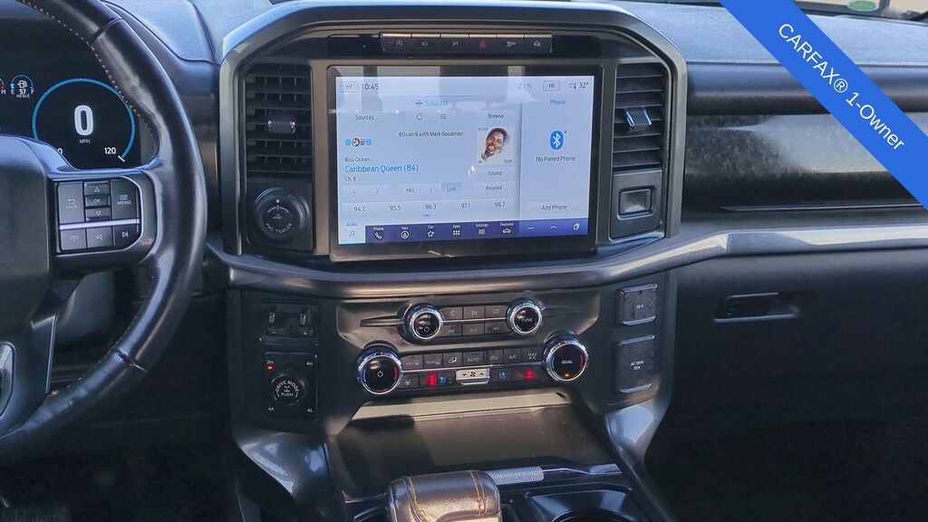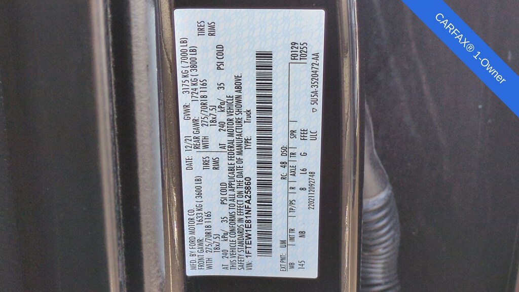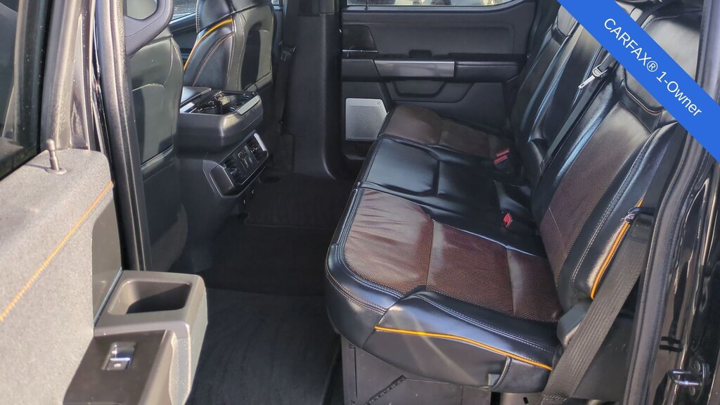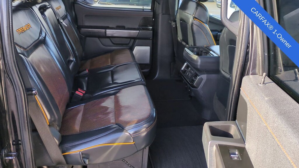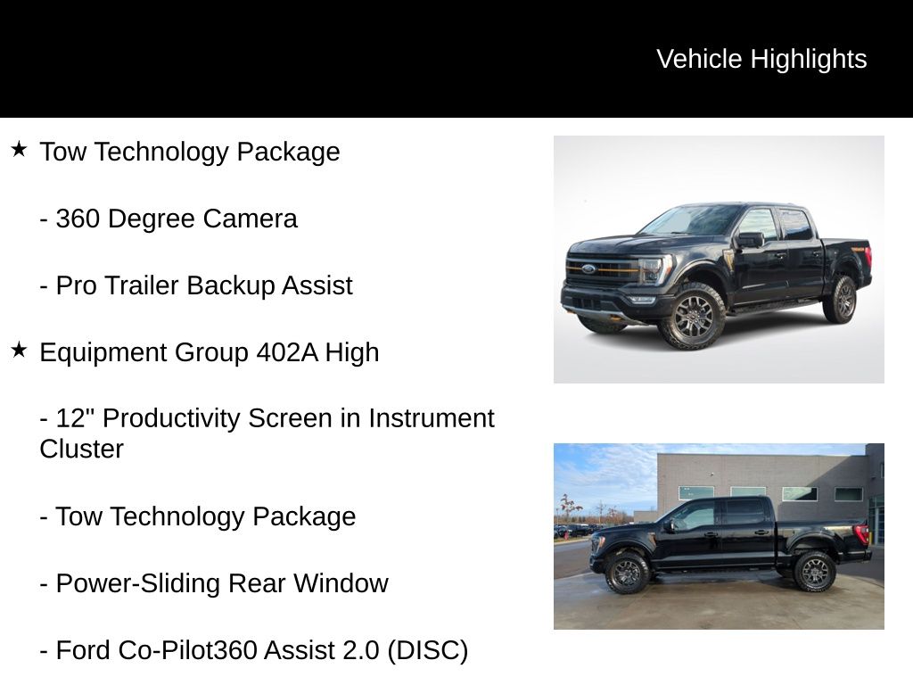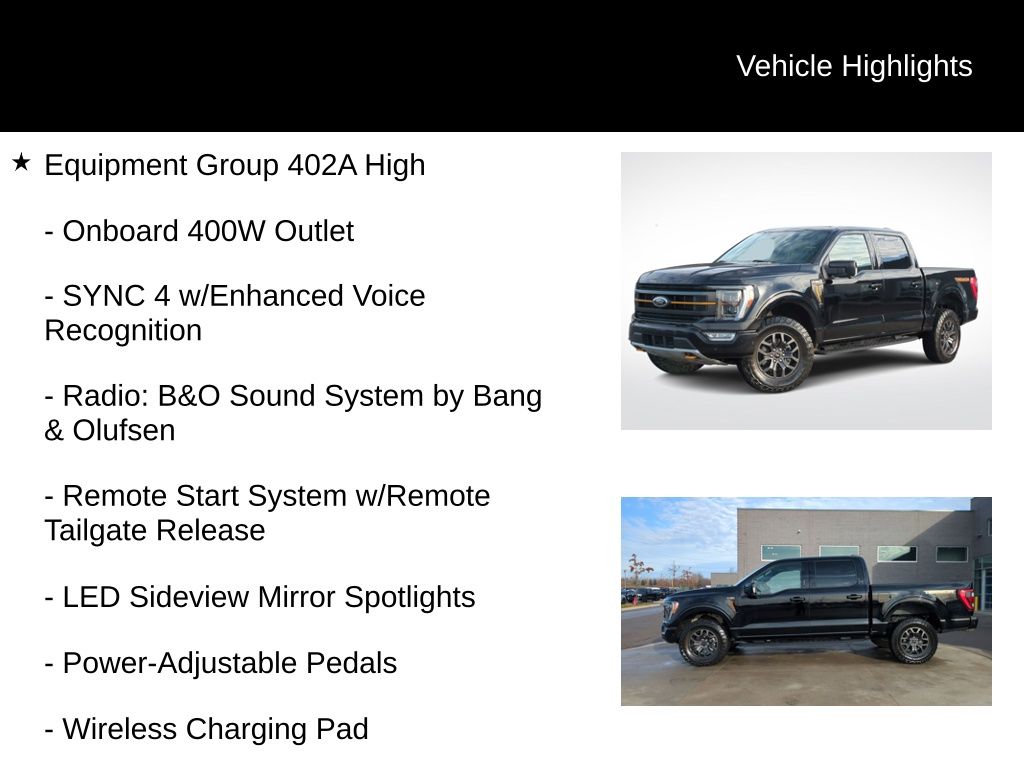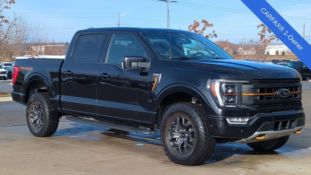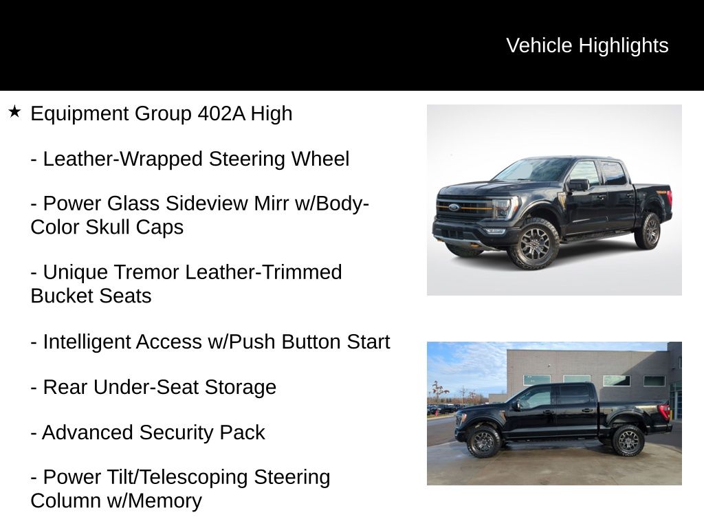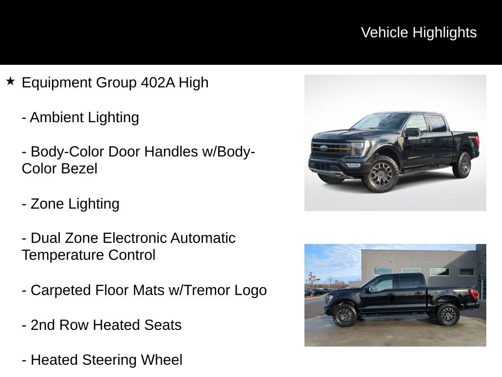 2022 Ford F-150 Tremor Is nicely equipped with Equipment Group 402A High (12" Productivity Screen in Instrument Cluster, 2nd Row Heated Seats, Advanced Security Pack, Ambient Lighting, Body-Color Door Handles w/Body-Color Bezel, Carpeted Floor Mats w/Tremor Logo, Dual Zone Electronic Automatic Temperature Control, Electronic Locking w/3.73 Axle Ratio, Extended Range 36 Gallon Fuel Tank, Heated Steering Wheel, Intelligent Access w/Push Button Start, Leather-Wrapped Steering Wheel, LED Projector w/Dynamic Bending Headlamps, LED Sideview Mirror Spotlights, Onboard 400W Outlet, Power Glass Sideview Mirr w/Body-Color Skull Caps, Power Tilt/Telescoping Steering Column w/Memory, Power-Adjustable Pedals, Power-Sliding Rear Window, Radio: B&O Sound System by Bang & Olufsen, Rain-Sensing Wipers, Rear Under-Seat Storage, Remote Start System w/Remote Tailgate Release, SYNC 4 w/Enhanced Voice Recognition, Trail Control, Unique Tremor Leather-Trimmed Bucket Seats, Universal Garage Door Opener, Wireless Charging Pad, and Zone Lighting), Ford Co-Pilot360 Assist 2.0 (DISC), GVWR: 7,050 lbs Payload Package, Tow Technology Package, 4WD, ABS brakes, Alloy wheels, Compass, Electronic Stability Control, Heated door mirrors, Illuminated entry, Low tire pressure warning, Rear-View Camera, Remote keyless entry, Traction control, 4-Wheel Disc Brakes, 6 Speakers, Air Conditioning, AM/FM radio: SiriusXM with 360L, Auto High Beam, Auto High-beam Headlights, Brake assist, Bumpers: body-color, Class IV Trailer Hitch Receiver, Delay-off headlights, Driver door bin, Dual front impact airbags, Dual front side impact airbags, Emergency communication system: SYNC 4 911 Assist, Exterior Parking Camera Rear, Front anti-roll bar, Front Bucket Seats, Front Center Armrest, Front fog lights, Front reading lights, Front wheel independent suspension, Fully automatic headlights, Lane-Keeping System, Navigation system: Connected Navigation, Occupant sensing airbag, Outside temperature display, Overhead airbag, Overhead console, Panic alarm, Passenger door bin, Passenger vanity mirror, Power door mirrors, Power steering, Power windows, Pre-Collision Assist w/Automatic Emergency Braking, Radio data system, Radio: AM/FM SiriusXM w/360L, Rear reading lights, Rear step bumper, Rear window defroster, Security system, Speed control, Speed-sensing steering, Split folding rear seat, Steering wheel mounted audio controls, Tachometer, Telescoping steering wheel, Tilt steering wheel, Trip computer, Unique Sport Cloth 40/Console/40 Front Seat, Variably intermittent wipers, Voltmeter, and Wheels: 18" Alloy w/Dark Matte Finish.