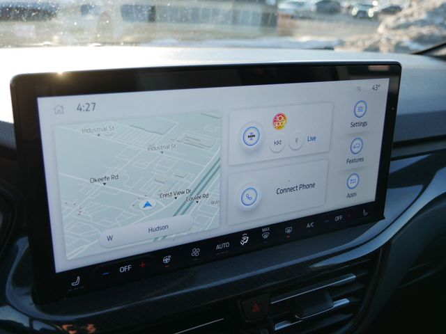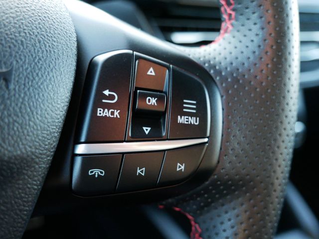 Inside, the ST-Line trim offers a driver-focused cabin with premium cloth and leather-trimmed seats, a leather-wrapped steering wheel, and dual-zone automatic climate control. Technology features include a large SYNC 4 touchscreen with Apple CarPlay and Android Auto, push-button start, a premium audio system, and a hands-free power liftgate. Every drive is connected, and convenient.