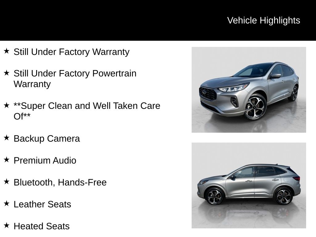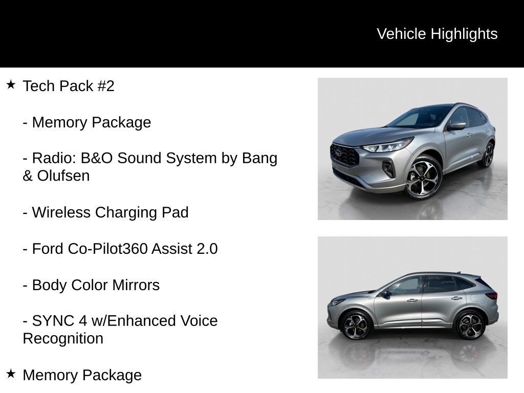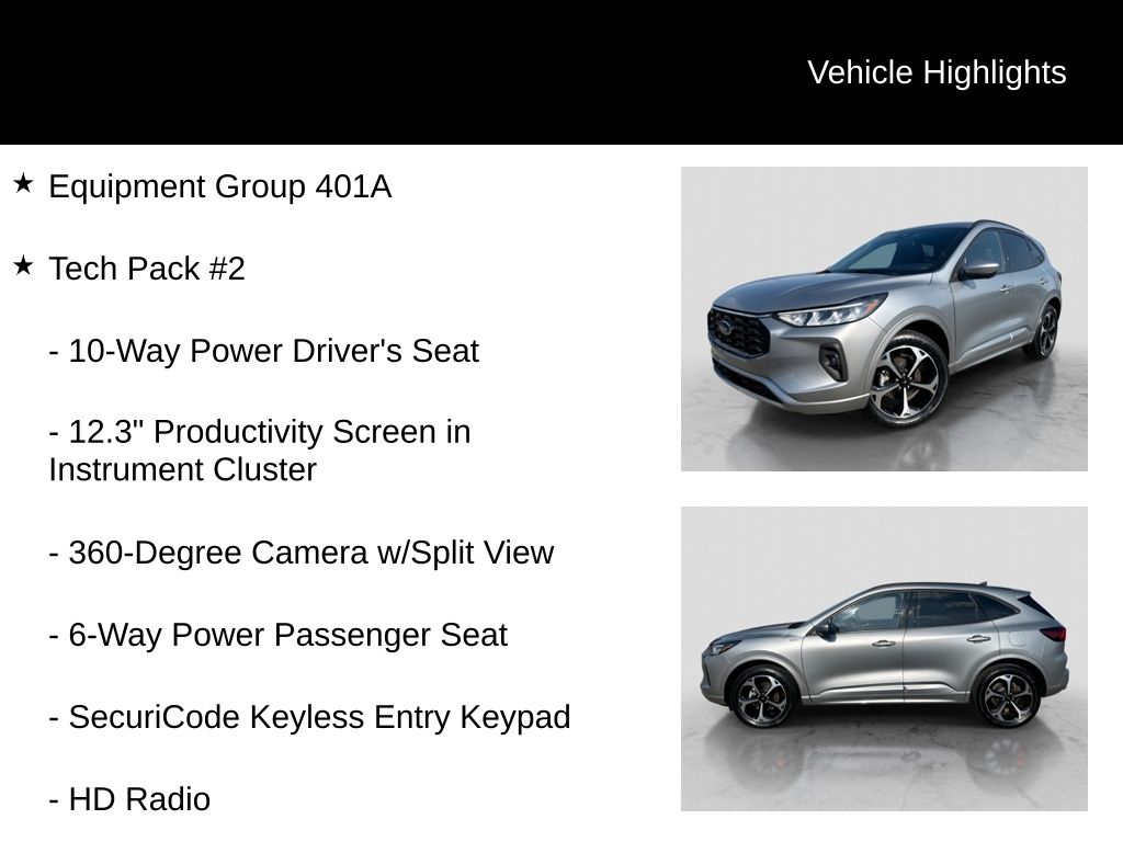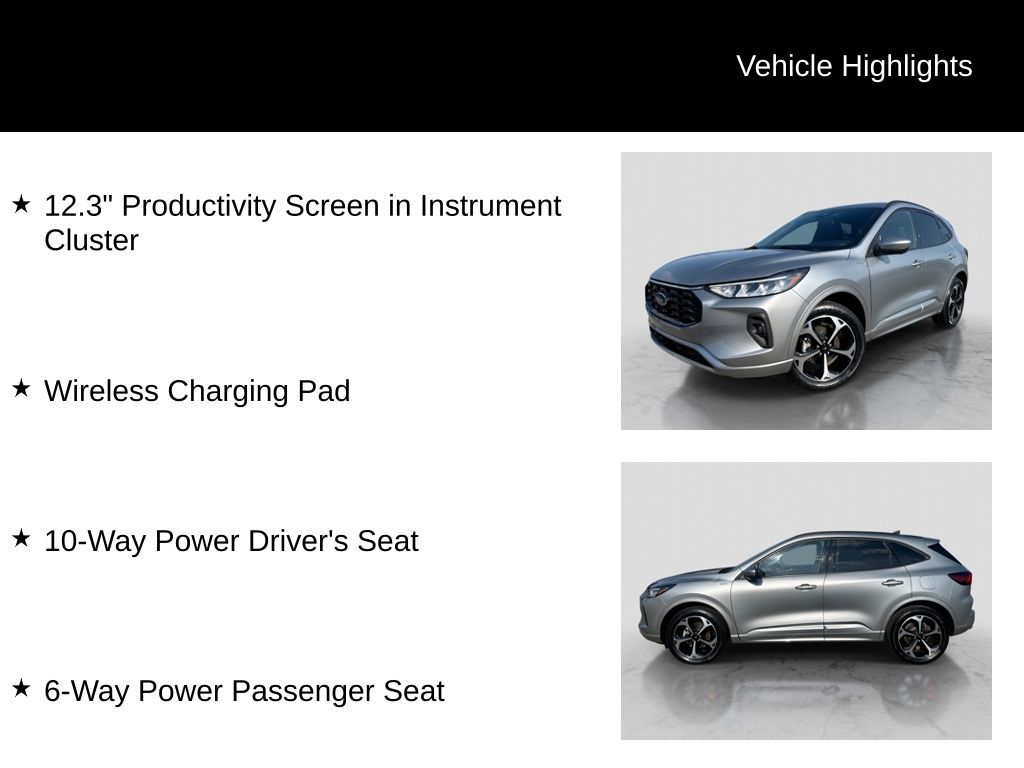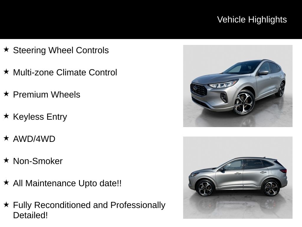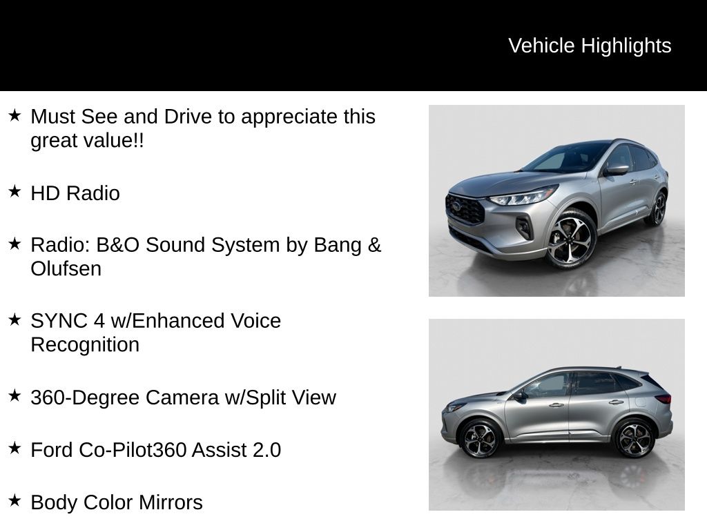 Recent Arrival! 2023 Ford Escape ST-Line Select Is nicely equipped with Equipment Group 401A, Memory Package, Tech Pack #2 (10-Way Power Driver's Seat, 12.3" Productivity Screen in Instrument Cluster, 360-Degree Camera w/Split View, 6-Way Power Passenger Seat, Body Color Mirrors, Ford Co-Pilot360 Assist 2.0, HD Radio, Radio: B&O Sound System by Bang & Olufsen, SecuriCode Keyless Entry Keypad, SYNC 4 w/Enhanced Voice Recognition, Wireless Charging Pad, Connected Built-In Navigation, Intelligent Adaptive Cruise Control w/Stop-and-Go, Intersection Assist, Rear Parking Sensor, Reverse Brake Assist, and Speed Sign Recognition), AWD, 2.91 Axle Ratio, 4-Wheel Disc Brakes, 6 Speakers, ABS brakes, Air Conditioning, Alloy wheels, AM/FM radio: SiriusXM, AM/FM Stereo, Auto High-beam Headlights, Automatic temperature control, Brake assist, Bumpers: body-color, Compass, Delay-off headlights, Driver door bin, Driver vanity mirror, Dual front impact airbags, Dual front side impact airbags, Electronic Fuel Door Release, Electronic Stability Control, Emergency communication system: SYNC 4 911 Assist, Exterior Parking Camera Rear, FordPass Connect, Four wheel independent suspension, Front anti-roll bar, Front Bucket Seats, Front Center Armrest, Front dual zone A/C, Front fog lights, Front reading lights, Fully automatic headlights, Heated door mirrors, Heated front seats, Heated steering wheel, Heated Vinyl/Cloth Front Sport Contour Bucket Seats, Illuminated entry, Knee airbag, Low tire pressure warning, Neutral Towing Capability, Occupant sensing airbag, Outside temperature display, Overhead airbag, Overhead console, Panic alarm, Passenger door bin, Passenger vanity mirror, Pedestrian Alert Sounder, Power door mirrors, Power driver seat, Power Liftgate, Power steering, Power windows, Radio data system, Rear anti-roll bar, Rear reading lights, Rear seat center armrest, Rear window defroster, Rear window wiper, Remote keyless entry, Speed control, Speed-sensing steering, Speed-Sensitive Wipers, Split folding rear seat, Spoiler, Sport steering wheel, Steering wheel mounted audio controls, SYNC 4, Tachometer, Telescoping steering wheel, Tilt steering wheel, Traction control, Trip computer, Variably intermittent wipers, Wheel-Locking Lug Nuts, Wheels: 18" Rock Metallic Painted Aluminum, and Wheels: 19" Machined-Face Ebony-Painted Aluminum.