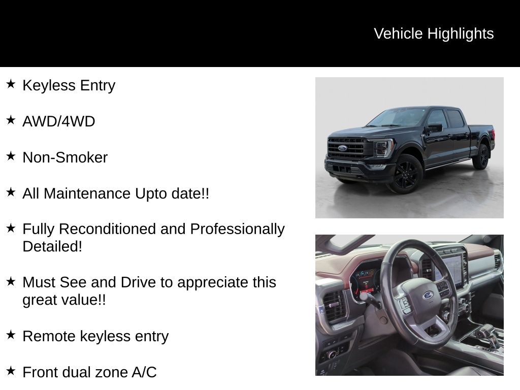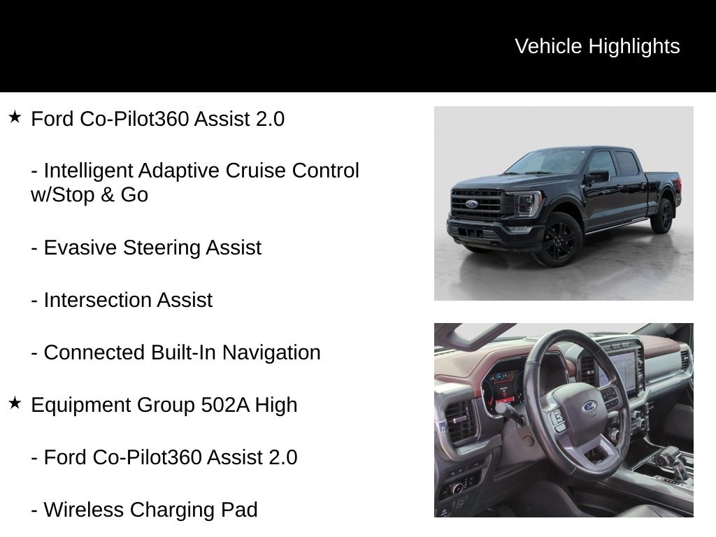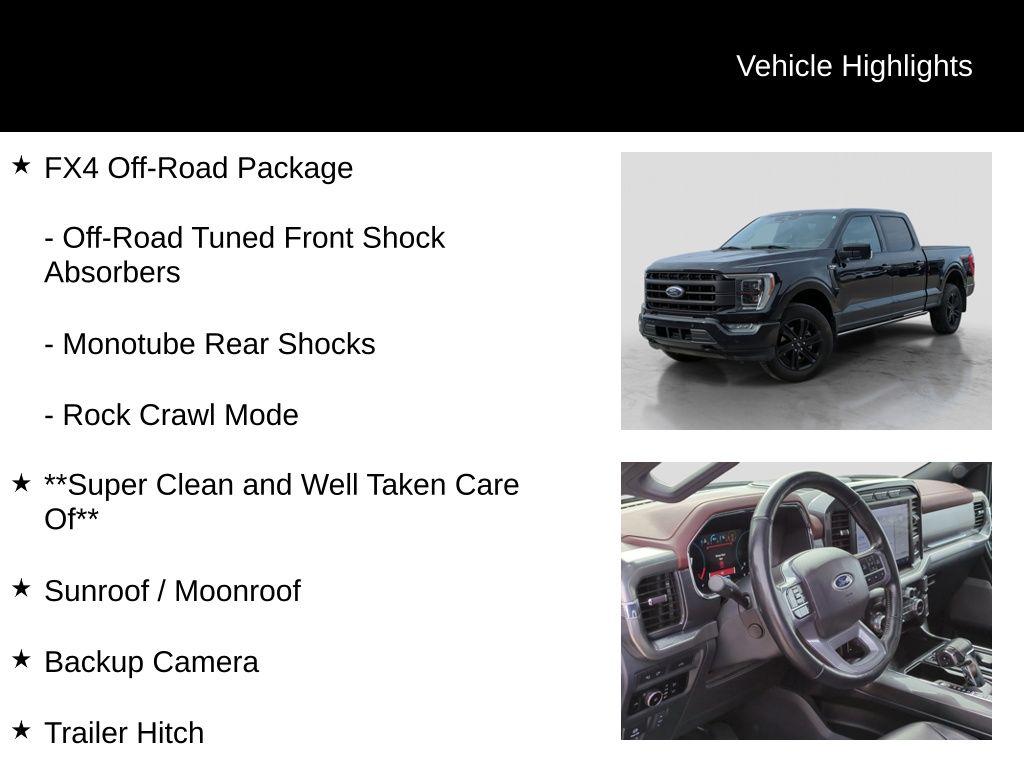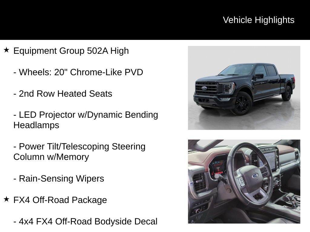 Recent Arrival! Clean CARFAX. Certified. 2023 Ford F-150 Lariat Is nicely equipped with Equipment Group 502A High (2nd Row Heated Seats, LED Projector w/Dynamic Bending Headlamps, Power Tilt/Telescoping Steering Column w/Memory, Rain-Sensing Wipers, Wheels: 20" Chrome-Like PVD, and Wireless Charging Pad), Ford Co-Pilot360 Assist 2.0, FX4 Off-Road Package (4x4 FX4 Off-Road Bodyside Decal, Hill Descent Control, Monotube Rear Shocks, Off-Road Tuned Front Shock Absorbers, and Rock Crawl Mode), Ford Blue Advantage: Blue Certified Certified, 4WD, ABS brakes, Alloy wheels, Compass, Electronic Stability Control, Front dual zone A/C, Heated door mirrors, Heated front seats, Illuminated entry, Low tire pressure warning, Remote keyless entry, Traction control, Twin Panel Moonroof, 4-Wheel Disc Brakes, 8 Speakers, Adjustable pedals, Air Conditioning, AM/FM radio: SiriusXM with 360L, Auto High-beam Headlights, Auto-dimming door mirrors, Auto-dimming Rear-View mirror, Automatic temperature control, Brake assist, Bumpers: chrome, Chrome wheels, Class IV Trailer Hitch Receiver, Delay-off headlights, Driver door bin, Driver vanity mirror, Dual front impact airbags, Dual front side impact airbags, Emergency communication system: SYNC 4 911 Assist, Exterior Parking Camera Rear, Front anti-roll bar, Front Bucket Seats, Front Center Armrest, Front fog lights, Front reading lights, Front wheel independent suspension, Fully automatic headlights, Garage door transmitter, Heated steering wheel, Memory seat, Occupant sensing airbag, Outside temperature display, Overhead airbag, Overhead console, Panic alarm, Passenger door bin, Passenger vanity mirror, Pedal memory, Power door mirrors, Power driver seat, Power passenger seat, Power steering, Power windows, Radio data system, Radio: B&O Sound System by Bang & Olufsen, Rear reading lights, Rear seat center armrest, Rear step bumper, Rear window defroster, Security system, Speed control, Speed-sensing steering, Split folding rear seat, Steering wheel mounted audio controls, SYNC 4 w/Enhanced Voice Recognition, Tachometer, Telescoping steering wheel, Tilt steering wheel, Trip computer, Turn signal indicator mirrors, Variably intermittent wipers, Ventilated front seats, Voltmeter, and Wheels: 18" Chrome-Like PVD.