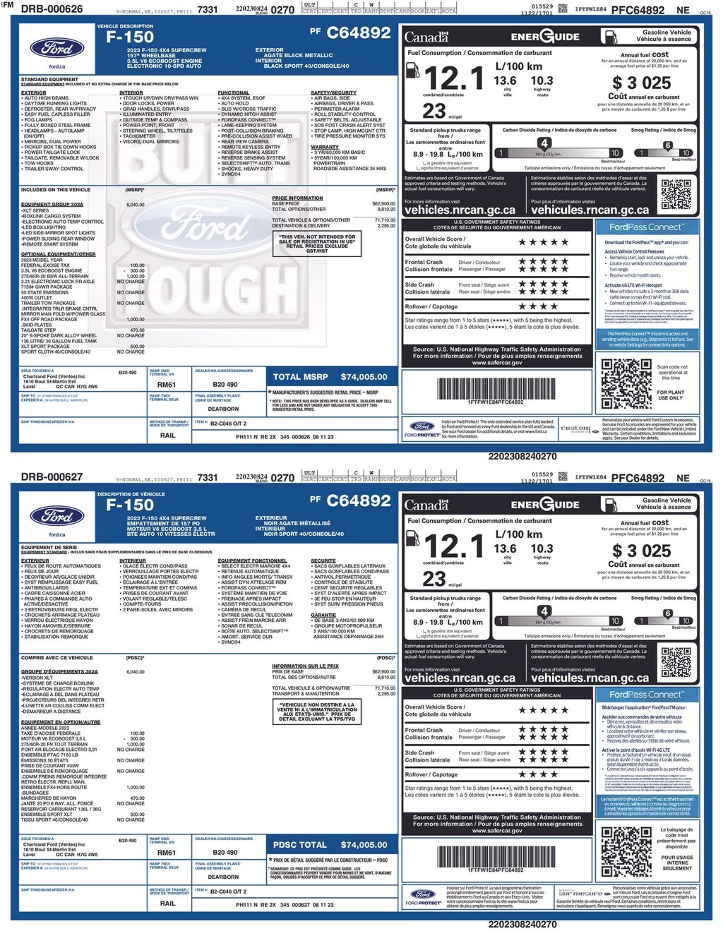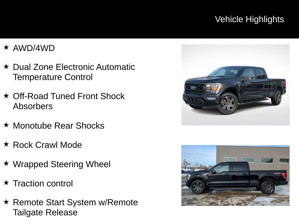 Clean CARFAX. 2023 Ford F-150 XLT Is nicely equipped with Equipment Group 302A High (10-Way Power Driver & Passenger Seats, 8" Productivity Screen in Instrument Cluster, Class IV Trailer Hitch Receiver, Dual Zone Electronic Automatic Temperature Control, Heated Front Seats, Intelligent Access w/Push Button Start, LED Reflector Headlamps, LED Sideview Mirror Spotlights, Onboard 400W Outlet, Power Glass Heated Sideview Mirrors, Rear Under-Seat Storage, Remote Start System w/Remote Tailgate Release, SYNC 4 w/Enhanced Voice Recognition, Wrapped Steering Wheel, and Zone Lighting), FX4 Off-Road Package (4x4 FX4 Off-Road Bodyside Decal, Hill Descent Control, Monotube Rear Shocks, Off-Road Tuned Front Shock Absorbers, and Rock Crawl Mode), XLT Sport Appearance Package (Accent-Color Step Bars, Black 2-Bar Style Grille w/Black Surround/Accents, Body-Color Door & Tailgate Handles, Body-Color Front & Rear Bumpers, Box Side Decals, Unique Sport Cloth 40/Console/40 Front-Seats, and Wheels: 18" 6-Spoke Machined Aluminum), 4WD, ABS brakes, Alloy wheels, Compass, Electronic Stability Control, Heated door mirrors, Illuminated entry, Low tire pressure warning, Remote keyless entry, Traction control, 4-Wheel Disc Brakes, 6 Speakers, Air Conditioning, AM/FM radio, Auto High-beam Headlights, Brake assist, Bumpers: chrome, Cloth 40/20/40 Front Seat, Delay-off headlights, Driver door bin, Driver vanity mirror, Dual front impact airbags, Dual front side impact airbags, Emergency communication system: SYNC 4 911 Assist, Exterior Parking Camera Rear, Front anti-roll bar, Front Center Armrest w/Storage, Front fog lights, Front reading lights, Front wheel independent suspension, Fully automatic headlights, Occupant sensing airbag, Outside temperature display, Overhead airbag, Overhead console, Panic alarm, Passenger door bin, Passenger vanity mirror, Power door mirrors, Power steering, Power windows, Radio data system, Radio: AM/FM Stereo w/6 Speakers, Rear reading lights, Rear step bumper, Rear window defroster, Security system, Speed control, Speed-sensing steering, Split folding rear seat, Steering wheel mounted audio controls, SYNC 4, Tachometer, Telescoping steering wheel, Tilt steering wheel, Trip computer, Variably intermittent wipers, Voltmeter, and Wheels: 17" Silver Painted Aluminum.