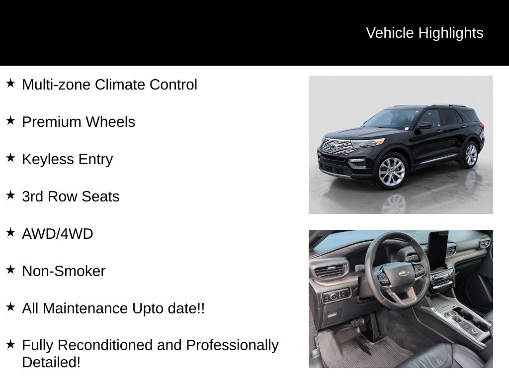 2024 Ford Explorer Platinum Is nicely equipped with Class IV Trailer Tow Package, Equipment Group 601A, Technology Package (10.1" LCD Capacitive Portrait Touchscreen and 2 Additional Speakers), 4WD, Twin Panel Moonroof, 12 Speakers, 3.31 Non-Limited-Slip Rear Axle Ratio, 360-Degree Camera Credit, 3rd row seats: bench, 4-Wheel Disc Brakes, 4G LTE Wi-Fi Hotspot Credit, ABS brakes, Air Conditioning, Alloy wheels, AM/FM radio: SiriusXM, Auto High-beam Headlights, Auto-dimming door mirrors, Auto-dimming Rear-View mirror, Automatic temperature control, Brake assist, Bumpers: body-color, Compass, Delay-off headlights, Driver door bin, Driver vanity mirror, Dual front impact airbags, Dual front side impact airbags, Electronic Stability Control, Emergency communication system: SYNC 3 911 Assist, Exterior Parking Camera Rear, FordPass Connect, Four wheel independent suspension, Front & Second Row Floor Liners (16B), Front anti-roll bar, Front Bucket Seats, Front Center Armrest, Front dual zone A/C, Front fog lights, Front reading lights, Fully automatic headlights, Garage door transmitter, Genuine wood dashboard insert, Heated door mirrors, Heated front seats, Heated rear seats, Heated steering wheel, Illuminated entry, Knee airbag, Leather Htd/Ventilated Sport Captain's Chairs, Leather steering wheel, Low tire pressure warning, Memory seat, Navigation System, Occupant sensing airbag, Outside temperature display, Overhead airbag, Overhead console, Panic alarm, Passenger door bin, Passenger vanity mirror, Power door mirrors, Power driver seat, Power Liftgate, Power passenger seat, Power steering, Power windows, Radio data system, Radio: B&O Sound System by Bang & Olufsen, Rain sensing wipers, Rear air conditioning, Rear anti-roll bar, Rear reading lights, Rear window defroster, Rear window wiper, Remote keyless entry, Reverse Brake Assist Credit, Security system, Speed control, Speed-sensing steering, Speed-Sensitive Wipers, Split folding rear seat, Spoiler, Steering wheel memory, Steering wheel mounted audio controls, SYNC 3 Communications & Entertainment System, SYNC 3/Apple CarPlay/Android Auto, Tachometer, Telescoping steering wheel, Tilt steering wheel, Traction control, Trip computer, Turn signal indicator mirrors, Variably intermittent wipers, Ventilated front seats, Voice-Activated Touchscreen Navigation System, and Wheels: 21" Bright Machined-Face Aluminum.
