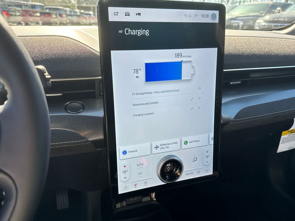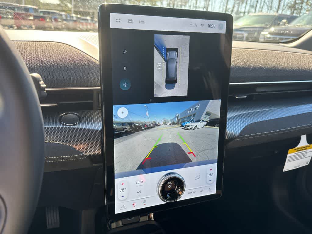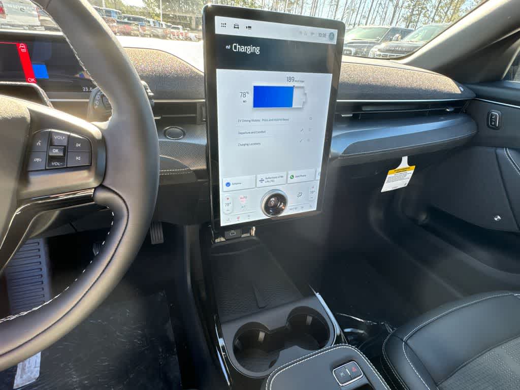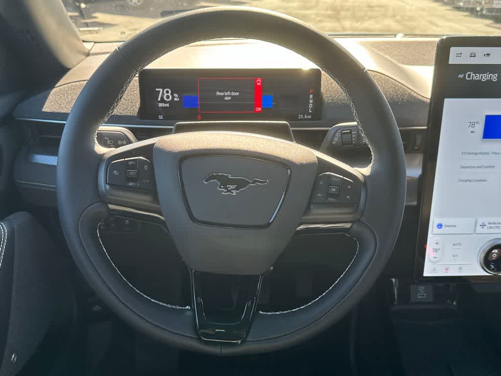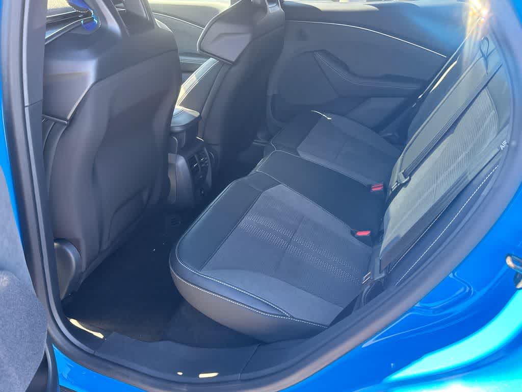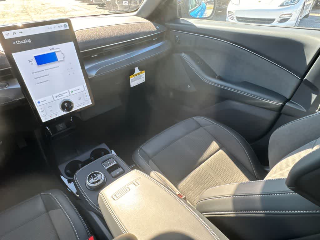 Mustang Mach-E GT is nicely equipped with Equipment Group 400A, Interior Protection Package (Pre-Installed) (Cargo Area Cover), 10 Speakers, 4-Wheel Disc Brakes, ABS brakes, Adaptive suspension, Air Conditioning, Alloy wheels, AM/FM radio: SiriusXM with 360L, AM/FM Stereo, Auto High-beam Headlights, Auto-dimming Rear-View mirror, Automatic temperature control, Axle Ratio: 9.791, Brake assist, Bumpers: body-color, Compass, Delay-off headlights, Driver door bin, Driver vanity mirror, Dual front impact airbags, Dual front side impact airbags, Electronic Stability Control, Emergency communication system: 911 Assist, Exterior Parking Camera Rear, Four wheel independent suspension, Front anti-roll bar, Front Bucket Seats, Front Center Armrest, Front dual zone A/C, Front reading lights, Fully automatic headlights, Garage door transmitter, Heated door mirrors, Heated front seats, Heated Perforated ActiveX Performance Seats, Heated steering wheel, Hood & Decklid Stripe/Door Graphics Delete, Illuminated entry, Knee airbag, Low tire pressure warning, Memory seat, Mobile Power Cord (120V/240V), Mustang Mach-E GT Performance Upgrade, Navigation System, Occupant sensing airbag, Outside temperature display, Overhead airbag, Overhead console, Panic alarm, Panoramic Fixed-Glass Roof, Passenger door bin, Passenger vanity mirror, Power door mirrors, Power driver seat, Power Liftgate, Power passenger seat, Power steering, Power windows, Radio data system, Rain sensing wipers, Rear anti-roll bar, Rear seat center armrest, Rear side impact airbag, Rear window defroster, Rear window wiper, Remote keyless entry, Security system, SiriusXM Radio w/360L, Speed control, Speed-sensing steering, Speed-Sensitive Wipers, Split folding rear seat, Spoiler, Steering wheel mounted audio controls, SYNC 4A w/Enhanced Voice Recognition, Telescoping steering wheel, Tilt steering wheel, Traction control, Trip computer, Turn signal indicator mirrors, Variably intermittent wipers, Wheels: 20 Machined Face Aluminum, and Wheels: 20 Machined-Face Aluminum.