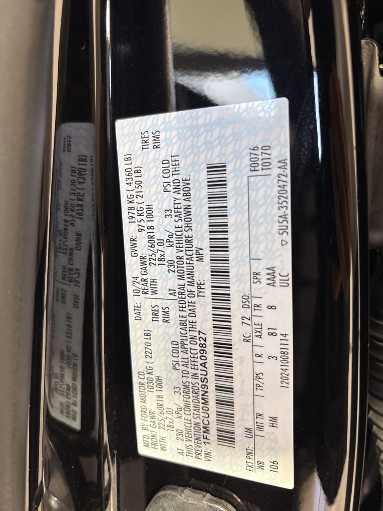 This Escape is well equipped with Equipment Group 300A, Escape ST-Line, 4D Sport Utility, 1.5L EcoBoost, 8-Speed Automatic, FWD, Black Metallic, Ebony Cloth, 3.81 Axle Ratio, 4-Wheel Disc Brakes, 6 Speakers, ABS brakes, Air Conditioning, Alloy wheels, AM/FM radio: SiriusXM, AM/FM Stereo, Auto High-beam Headlights, Automatic temperature control, Brake assist, Bumpers: body-color, Compass, Delay-off headlights, Driver door bin, Driver vanity mirror, Dual front impact airbags, Dual front side impact airbags, Electronic Stability Control, Emergency communication system: SYNC 4 911 Assist, FordPass Connect, Four wheel independent suspension, Front anti-roll bar, Front Bucket Seats, Front Center Armrest, Front dual zone A/C, Front reading lights, Fully automatic headlights, Illuminated entry, Internet access capable: FordPass Connect 4G, Knee airbag, Low tire pressure warning, Occupant sensing airbag, Outside temperature display, Overhead airbag, Overhead console, Panic alarm, Passenger door bin, Passenger vanity mirror, Power door mirrors, Power driver seat, Power steering, Power windows, Radio data system, Rear anti-roll bar, Rear reading lights, Rear seat center armrest, Rear window defroster, Rear window wiper, Remote keyless entry, Speed control, Speed-sensing steering, Speed-Sensitive Wipers, Split folding rear seat, Spoiler, Sport steering wheel, Steering wheel mounted audio controls, SYNC 4, Tachometer, Telescoping steering wheel, Tilt steering wheel, Traction control, Trip computer, Variably intermittent wipers, Vinyl/Cloth Front Sport Contour Bucket Seats, and Wheels: 18" Rock Metallic Painted Aluminum plus Equipment Group 300A, Escape ST-Line, 4D Sport Utility, 1.5L EcoBoost, 8-Speed Automatic, FWD, Black Metallic, Ebony Cloth, 3.81 Axle Ratio, 4-Wheel Disc Brakes, 6 Speakers, ABS brakes, Air Conditioning, Alloy wheels, AM/FM radio: SiriusXM, AM/FM Stereo, Auto High-beam Headlights, Automatic temperature control, Brake assist, Bumpers: body-color, Compass, Delay-off headlights, Driver door bin, Driver vanity mirror, Dual front impact airbags, Dual front side impact airbags, Electronic Stability Control, Emergency communication system: SYNC 4 911 Assist, FordPass Connect, Four wheel ind
