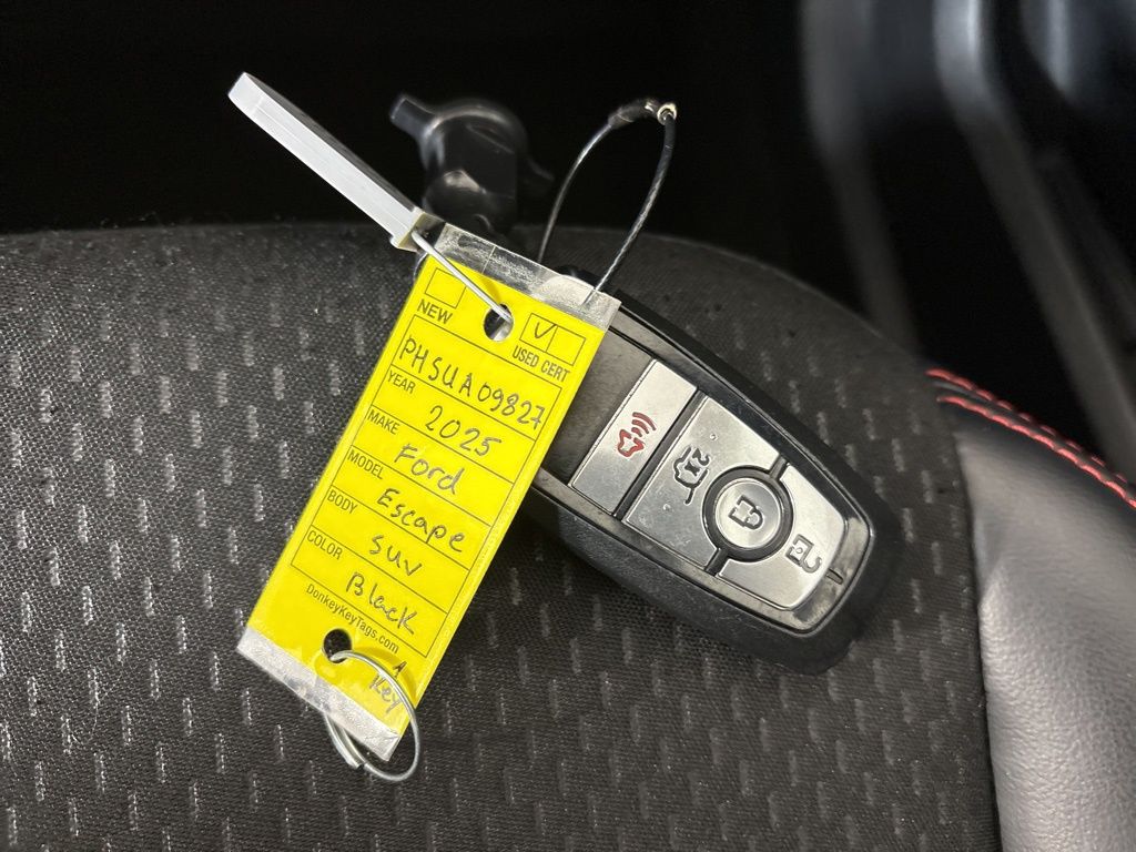 Black Metallic 2025 Ford Escape 4D Sport Utility ST-Line FWD 1.5L EcoBoost Escape ST-Line, 4D Sport Utility, 1.5L EcoBoost, 8-Speed Automatic, FWD, Black Metallic, Ebony Cloth, 3.81 Axle Ratio, 4-Wheel Disc Brakes, 6 Speakers, ABS brakes, Air Conditioning, Alloy wheels, AM/FM radio: SiriusXM, AM/FM Stereo, Auto High-beam Headlights, Automatic temperature control, Brake assist, Bumpers: body-color, Compass, Delay-off headlights, Driver door bin, Driver vanity mirror, Dual front impact airbags, Dual front side impact airbags, Electronic Stability Control, Emergency communication system: SYNC 4 911 Assist, Equipment Group 300A, FordPass Connect, Four wheel independent suspension, Front anti-roll bar, Front Bucket Seats, Front Center Armrest, Front dual zone A/C, Front reading lights, Fully automatic headlights, Illuminated entry, Internet access capable: FordPass Connect 4G, Knee airbag, Low tire pressure warning, Occupant sensing airbag, Outside temperature display, Overhead airbag, Overhead console, Panic alarm, Passenger door bin, Passenger vanity mirror, Power door mirrors, Power driver seat, Power steering, Power windows, Radio data system, Rear anti-roll bar, Rear reading lights, Rear seat center armrest, Rear window defroster, Rear window wiper, Remote keyless entry, Speed control, Speed-sensing steering, Speed-Sensitive Wipers, Split folding rear seat, Spoiler, Sport steering wheel, Steering wheel mounted audio controls, SYNC 4, Tachometer, Telescoping steering wheel, Tilt steering wheel, Traction control, Trip computer, Variably intermittent wipers, Vinyl/Cloth Front Sport Contour Bucket Seats, Wheels: 18" Rock Metallic Painted Aluminum.