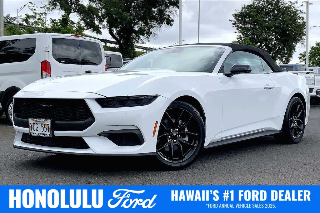 HONOLULU FORD! 808-532-1700, *DONT WAIT! CALL NOW!!, FINANCING AVAILABLE, GUARANTEED APPROVALS! LOW PAYMENTS! GREAT INTEREST RATES!, ***FORD CERTIFIED VEHICLE!! 172 POINT INSPECTION, OIL CHANGE, NEW WIPERS, NEW AIR FILTERS, FULL DET, WE SHIP TO NEIGHBOR ISLANDS!, 172 POINT INSPECTION BY FACTORY TRAINED TECHNICIANS!, STATE SAFETY INSPECTION COMPLETE!, APPLE CAR PLAY/ANDROID AUTO, BLUETOOTH HANDS FREE CALLING, ONE OWNER!!, ACCIDENT FREE CARFAX!, *LEATHER SEATS*, *HEATED SEATS, BACK-UP CAMERA, 360 SURROUND VISION CAMERA, EXTRA CLEAN, WELL TAKEN CARE OF, EXCELLENT FUEL ECONOMY, PREMIUM WHEELS, EXCELLENT CONDITION!, EXCELLENT SERVICE HISTORY!!, READY FOR YOU TO DRIVE HOME TODAY!, UPGRADED WHEELS, TOUCH SCREEN, 4-Wheel Disc Brakes, 9 Speakers, ABS brakes, Air Conditioning, Alloy wheels, AM/FM radio: SiriusXM with 360L, AM/FM Stereo, Auto High-beam Headlights, Automatic temperature control, Black Front & Rear Pony Badges, Black Mirror Caps, Brake assist, Bumpers: body-color, Compass, Convertible roof lining, Delay-off headlights, Driver door bin, Driver vanity mirror, Dual front impact airbags, Dual front side impact airbags, Electronic Stability Control, Emergency communication system: 911 Assist, Exterior Parking Camera Rear, Four wheel independent suspension, Front anti-roll bar, Front Bucket Seats, Front Center Armrest, Front dual zone A/C, Front reading lights, Fully automatic headlights, Glass rear window, Headlamps w/Black Bezels, Heated front seats, Illuminated entry, Internet access capable: FordPass Connect, Knee airbag, Leather Shift Knob, Low tire pressure warning, Mustang Nite Pony Package, Occupant sensing airbag, Outside temperature display, Overhead console, Panic alarm, Passenger door bin, Passenger vanity mirror, Power convertible roof, Power door mirrors, Power driver seat, Power steering, Power windows, Radio data system, Rain sensing wipers, Rear anti-roll bar, Rear Parking Sensors, Rear window defroster, Remote keyless entry, Security system, Shadow Black Blade Decklid Spoiler, Speed control, Speed-sensing steering, Speed-Sensitive Wipers, Sport steering wheel, Steering wheel mounted audio controls, SYNC 4, Tachometer, Telescoping steering wheel, Tilt steering wheel, Traction control, Trip computer, Variably intermittent wipers, Voltmeter, Wheels: 18 x 8 Machined-Face Aluminum, Wheels: 19 x 8.5 Ebony Black-Painted Aluminum. CARFAX One-Owner. Clean CARFAX. Oxford White 2025 Ford Mustang EcoBoost RWD 10-Speed Automatic EcoBoost 2.3L I4 GTDi DOHC Turbocharged VCT