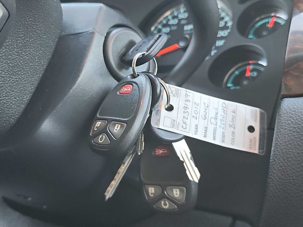 What a rare find! Our Accident Free, One Owner, Ultra Low Mileage 2012 GMC Sierra 2500HD Denali Crew Cab 4X4 dressed to impress in Onyx Black effortlessly handles your heaviest requirements. Powered by a TurboCharged 6.6 Liter DuraMax Diesel V8 provides 397hp connected to a 6 Speed Allison 1000 Automatic transmission designed to work way past quitting time. This Four Wheel Drive machine grapples with a payload of 4,212 pounds. In addition, its locking rear differential and trailering package augments your control and comfort when pulling or carrying weighty loads. The signature stance of our Denali commands the road with a unique chrome grille and chrome accents. Step bars, a drop-in bedliner, and a hard tonneau cover have also been installed.