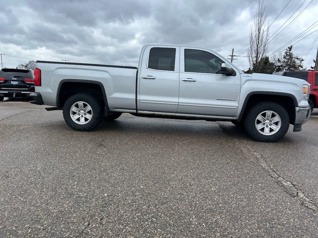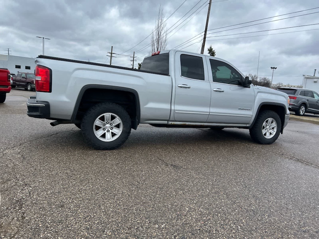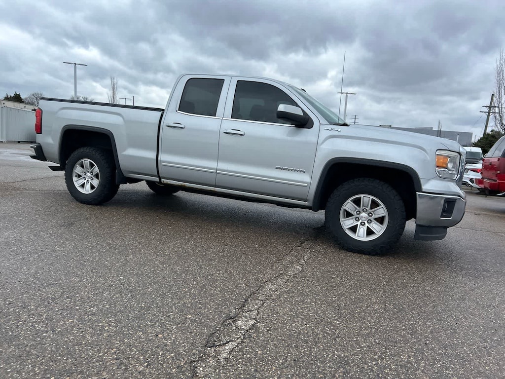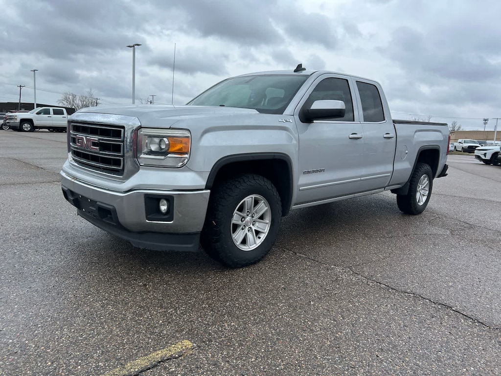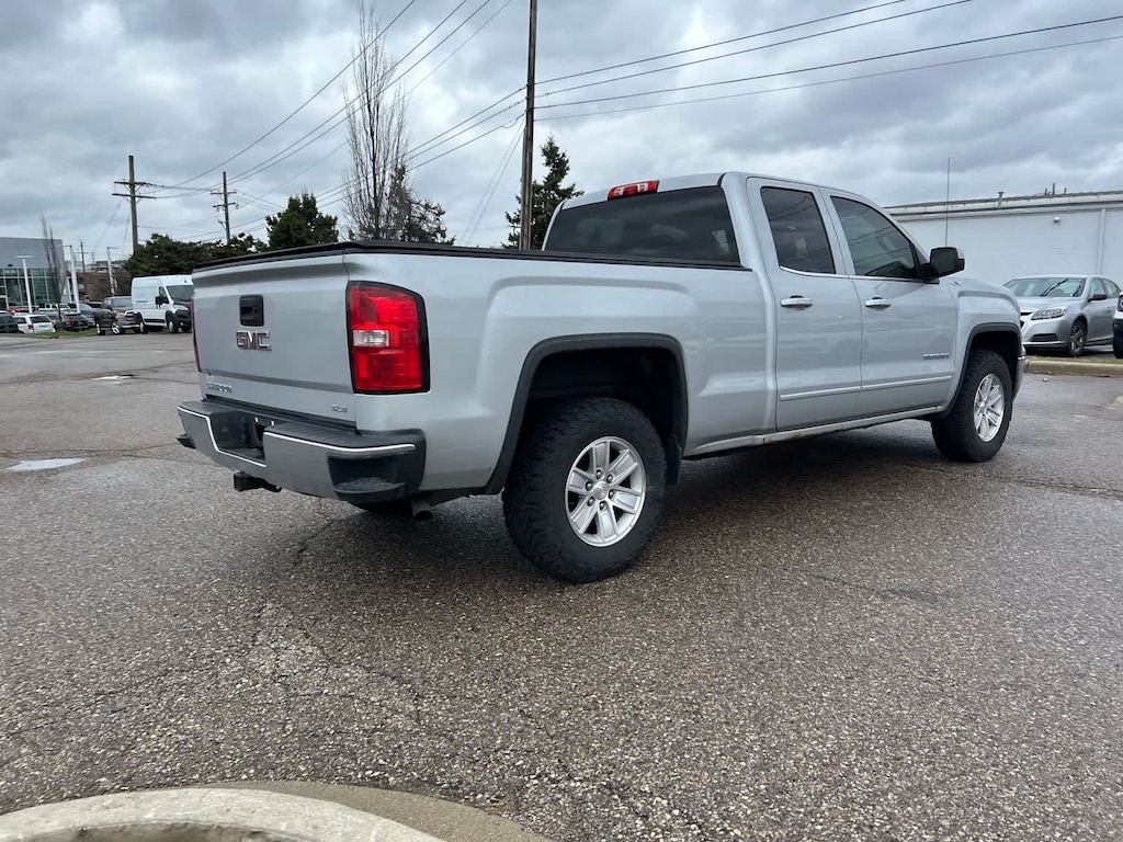 A stand-out among its peers, our Accident Free 2015 GMC Sierra 1500 SLE Double Cab 4X4 is presented in beautiful Quicksilver Metallic. Powered by a 5.3 Liter EcoTec3 V8 that provides 355hp with a tough 6 Speed Automatic transmission with Tow/Haul mode to provide towing capability. This Four Wheel Drive team helps you achieve nearly 22mpg on the highway and, paired with coil-over-shock front suspension, offers a controlled ride that is the ultimate in comfort and handling! Our hardworking Sierra 1500 SLE has a massive grille, distinct CornerStep chrome rear bumpers, a tow hitch receiver, a tonneau cover, and an EZ Lift and Lower locking tailgate.