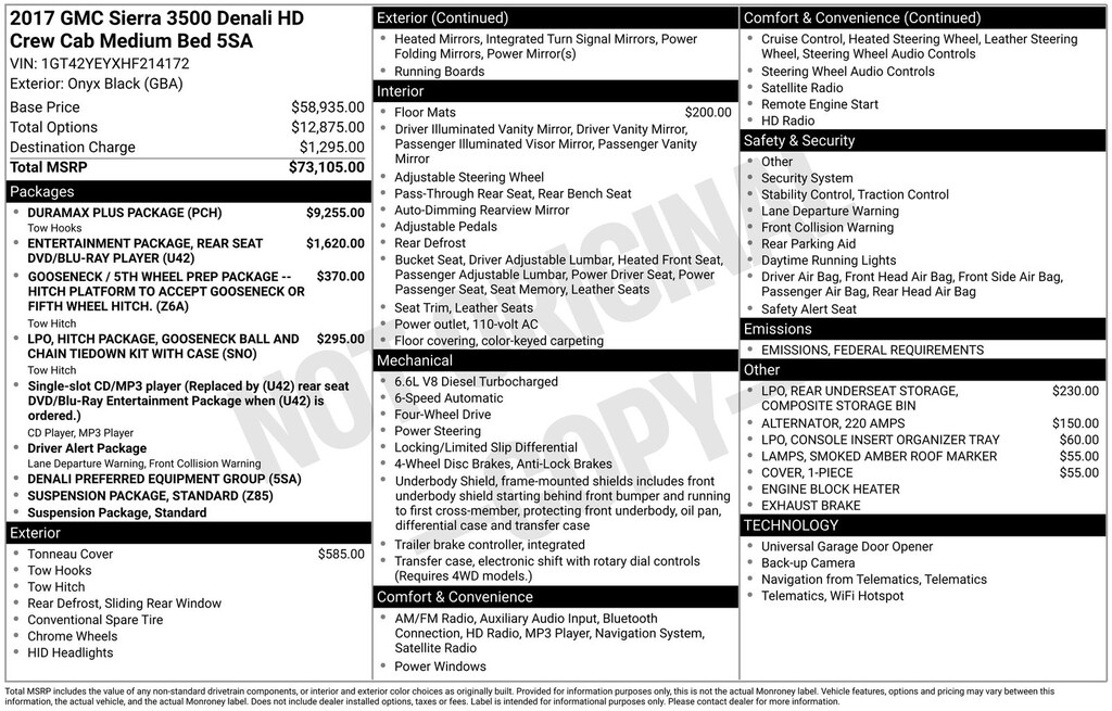 Recent Arrival! 2017 GMC Sierra 3500HD Denali Is nicely equipped with Driver Alert Package (Forward Collision Alert and Lane Departure Warning System), Duramax Plus Package (Chrome Recovery Hooks), Gooseneck/5th Wheel Prep Package, Hitch Package (LPO), Preferred Equipment Group 5SA (110-Volt AC Power Outlet, 150 Amps Alternator, 8" Multi-Color Customizable Driver Display, Auto-Dimming Inside Rear-View Mirror, Chrome Bodyside Moldings, Chrome Door Handles, Chrome Power-Adjustable Heated Outside Mirrors, Color-Keyed Carpeted 1st & 2nd Row Floor Mats, Color-Keyed Carpeting Floor Covering, Deep-Tinted Glass, Driver & Front Passenger Visors, Dual-Zone Automatic Climate Control, Electric Rear-Window Defogger, Electronic Shift Transfer Case, EZ-Lift & Lower Tailgate, Front Body-Color Bumper, Front Frame-Mounted Black Recovery Hooks, Front Halogen Fog Lamps, HD Radio, Heated & Ventilated Front Seating, Leather Wrapped Heated Steering Wheel, Manual Tilt-Wheel/Telescoping Steering Column, OnStar Guidance Plan For 3 Months, OnStar w/4G LTE, Power Adjustable Pedals, Power Sliding Rear Window w/Defogger, Power Windows, Rear 60/40 Folding Bench Seat (Folds Up), Rear Body-Color Bumper w/Bumper CornerSteps, Rear Vision Camera, Rear Wheelhouse Liners, Remote Keyless Entry, Remote Locking Tailgate, Remote Vehicle Starter System, Single-Slot CD/MP3 Player, Steering Wheel Audio Controls, Ultrasonic Front & Rear Park Assist, Unauthorized Entry Theft-Deterrent System, and Universal Home Remote), Rear Seat Entertainment Package, Standard Suspension Package, Trailering Equipment, Allison 1000 6-Speed Automatic, 4WD, Jet Black Leather, 1-Piece Radiator Grille & Fr Bumper Opening Cover, 18" Chromed Aluminum Wheels, 220 Amp Alternator, 4-Wheel Disc Brakes, 7 Speakers, ABS brakes, Adjustable pedals, Air Conditioning, All-Weather Floor Liner (LPO), Alloy wheels, AM/FM radio: SiriusXM, Apple CarPlay/Android Auto, Auto High-beam Headlights, Auto-dimming Rear-View mirror, Automatic temperature control, Bodyside moldings, Bose Speaker System, Brake assist, Bumpers: body-color, CD player, Chrome wheels, Compass, Console Insert Organizer Tray (LPO), Delay-off headlights, Driver door bin, Driver vanity mirror, Dual front impact airbags, Dual front side impact airbags, Electronic Stability Control, Emergency communication system: OnStar Guidance, Engine Block Heater, Exhaust Brake, Exterior Parking Camera Rear, Floor Mounted Console, Front anti-roll bar, Front Bucket Seats, Front Center Armrest, Front dual zone A/C, Front fog lights, Front Full Feature Bucket Seats, Front reading lights, Front wheel independent suspension, Fully automatic headlights, Garage door transmitter, Heated door mirrors, Heated Driver & Front Passenger Seats, Heated front seats, Heated steering wheel, High-Intensity Discharge Headlights, Illuminated entry, Memory seat, Navigation System, Occupant sensing airbag, Outside temperature display, Overhead airbag, Overhead console, Panic alarm, Passenger door bin, Passenger vanity mirror, Pedal memory, Perforated Leather-Appointed Seat Trim, Power door mirrors, Power driver seat, Power passenger seat, Power steering, Power windows, Premium audio system: IntelliLink, Radio: AM/FM/SiriusXM w/IntelliLink & Navigation, Rear reading lights, Rear seat center armrest, Rear step bumper, Rear Underseat Storage (LPO), Rear window defroster, Remote keyless entry, Security system, SiriusXM Satellite Radio, Smoked Amber Roof Marker Lamps, Speed control, Speed-sensing steering, Split folding rear seat, Steering wheel mounted audio controls, Tachometer, Telescoping steering wheel, Tilt steering wheel, Traction control, Trip computer, Turn signal indicator mirrors, Variably intermittent wipers, Ventilated front seats, Vinyl Tonneau Cvr w/Integrated Support Bows (LPO), Voltmeter, and Wireless Charging.
