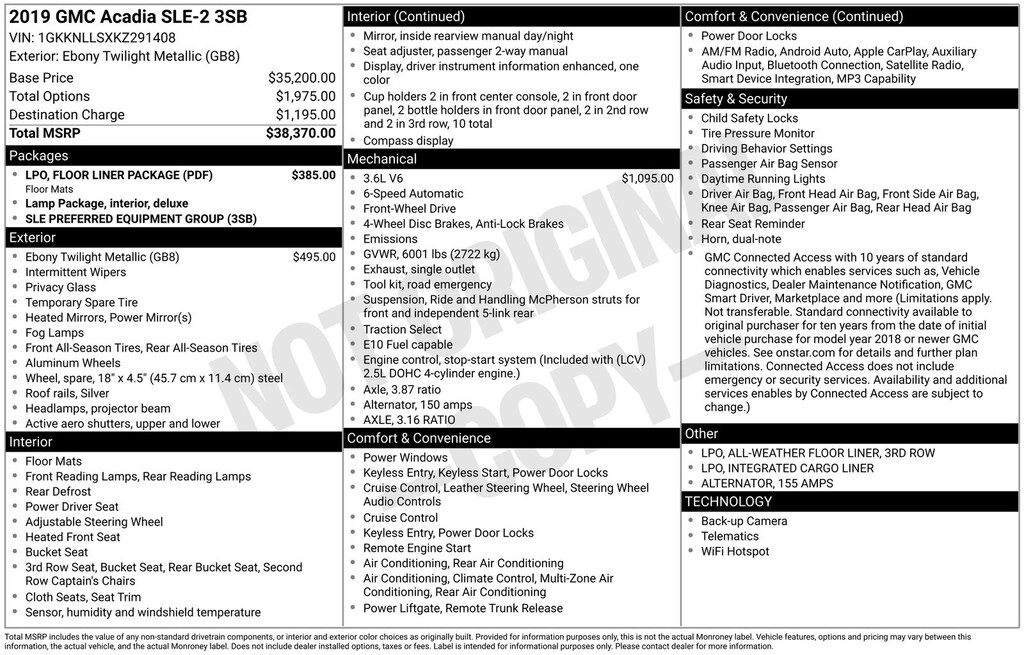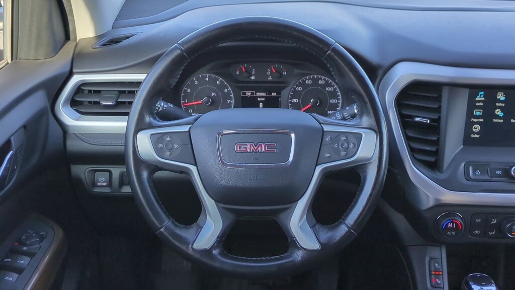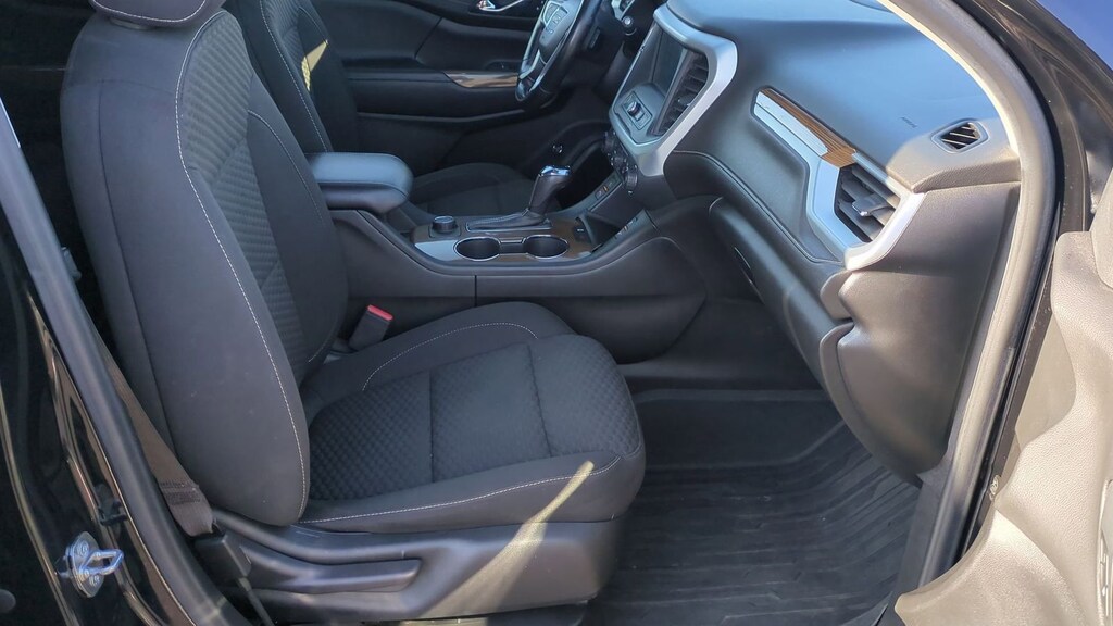 2019 GMC Acadia SLE-2 Is nicely equipped with Floor Liner Package (LPO) (3rd Row All-Weather Floor Liner (LPO), All-Weather Floor Liner (LPO), and Integrated Cargo Liner (LPO)), Preferred Equipment Group 3SB, FWD, Jet Black Cloth, 155 Amp Alternator, 18" x 7.5" Aluminum (4) Wheels, 3rd row seats: split-bench, 4-Wheel Disc Brakes, 6 Speakers, 6-Passenger (2-2-2 Seating Configuration), 6-Speaker Audio System Feature, ABS brakes, Air Conditioning, Alloy wheels, AM/FM radio: SiriusXM, Apple CarPlay/Android Auto, Automatic temperature control, Brake assist, Bumpers: body-color, Compass, Delay-off headlights, Driver door bin, Driver vanity mirror, Dual front impact airbags, Dual front side impact airbags, Electronic Stability Control, Emergency communication system: OnStar and GMC connected services capable, Exterior Parking Camera Rear, Four wheel independent suspension, Front anti-roll bar, Front Bucket Seats, Front Center Armrest, Front dual zone A/C, Front fog lights, Front reading lights, Fully automatic headlights, Heated door mirrors, Heated Driver & Front Passenger Seats, Heated front seats, Illuminated entry, Integrated Cargo Liner (LPO) (DISC), Knee airbag, Low tire pressure warning, Occupant sensing airbag, Outside temperature display, Overhead airbag, Overhead console, Panic alarm, Passenger door bin, Passenger vanity mirror, Power door mirrors, Power driver seat, Power Liftgate, Power steering, Power windows, Premium audio system: GMC Infotainment System, Premium Cloth Seat Trim, Radio data system, Radio: AM/FM w/7" Diagonal Color Touch Screen, Rear air conditioning, Rear anti-roll bar, Rear reading lights, Rear window defroster, Rear window wiper, Remote keyless entry, Roof rack: rails only, Security system, SiriusXM Radio, Speed control, Speed-sensing steering, Spoiler, Steering wheel mounted audio controls, Stop-Start Engine Control System, Tachometer, Telescoping steering wheel, Tilt steering wheel, Traction control, Trip computer, Variably intermittent wipers, and Voltmeter.